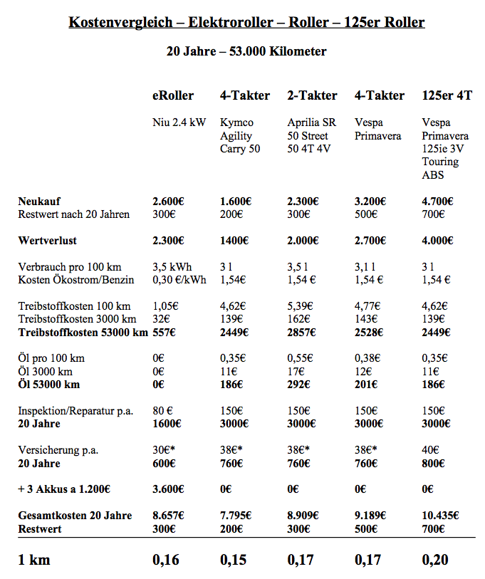 Der Elektroroller mit 3 teuren Ersatzakkus (Niu, Akku a 1.200€) kostet gleich viel bzw. ist eine Spur billiger als die Verbrenner