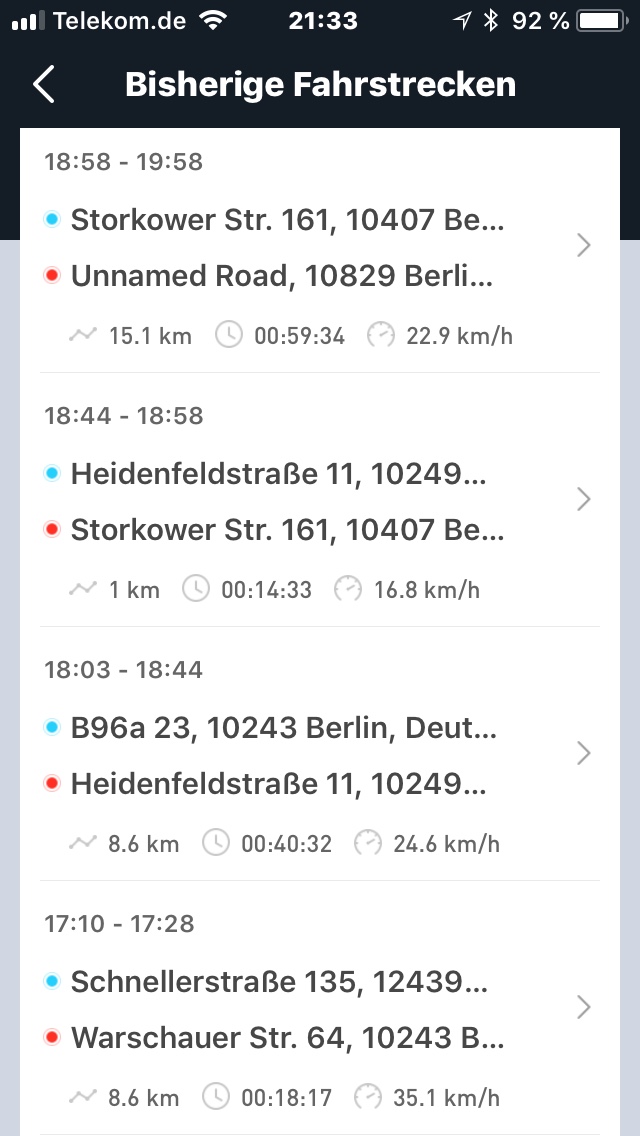 Die App nennt mir Durchschnittsgeschwindigkeiten von 16,8 bis 35,1 km/h. Wie die sich genau berechnet weiß ich nicht. Kurze Pausen werden vermutlich rausgerechnet. Anders kann ich mir nicht erklären, warum ich einmal 8,6km in 18 Minuten gefahren sein soll bei 35 km/h und einmal 8,6 km in 40 Minuten bei 24,6 km/h.