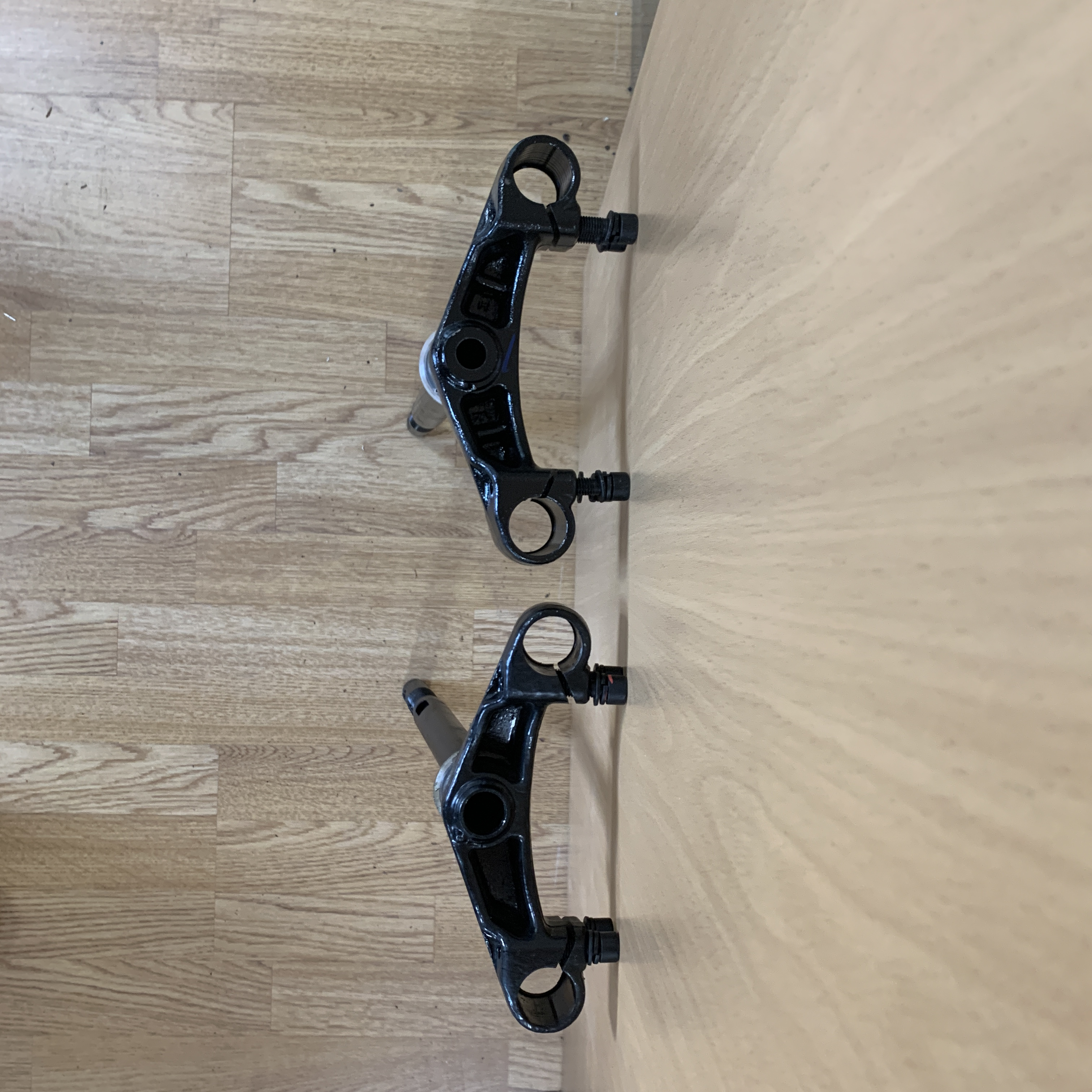 unten alt, oben neu. Man sieht recht schön, dass man die Materialdicke des Gabeldorns deutlich erhöht hat. Und wenn man sich mal das Innenleben der Gabelbrücke ansieht, sind die zusätzlichen Verstrebungen im Gußteil zu erkennen, die die Torsion (Vergrehung der Gabelbrücke, wie wenn man einen Lappen auswringt) verhindern sollen. Bislang: Toi toi toi. Ich hoffe die Konstrukteure haben da diesmal genauer nachgerechnet.
