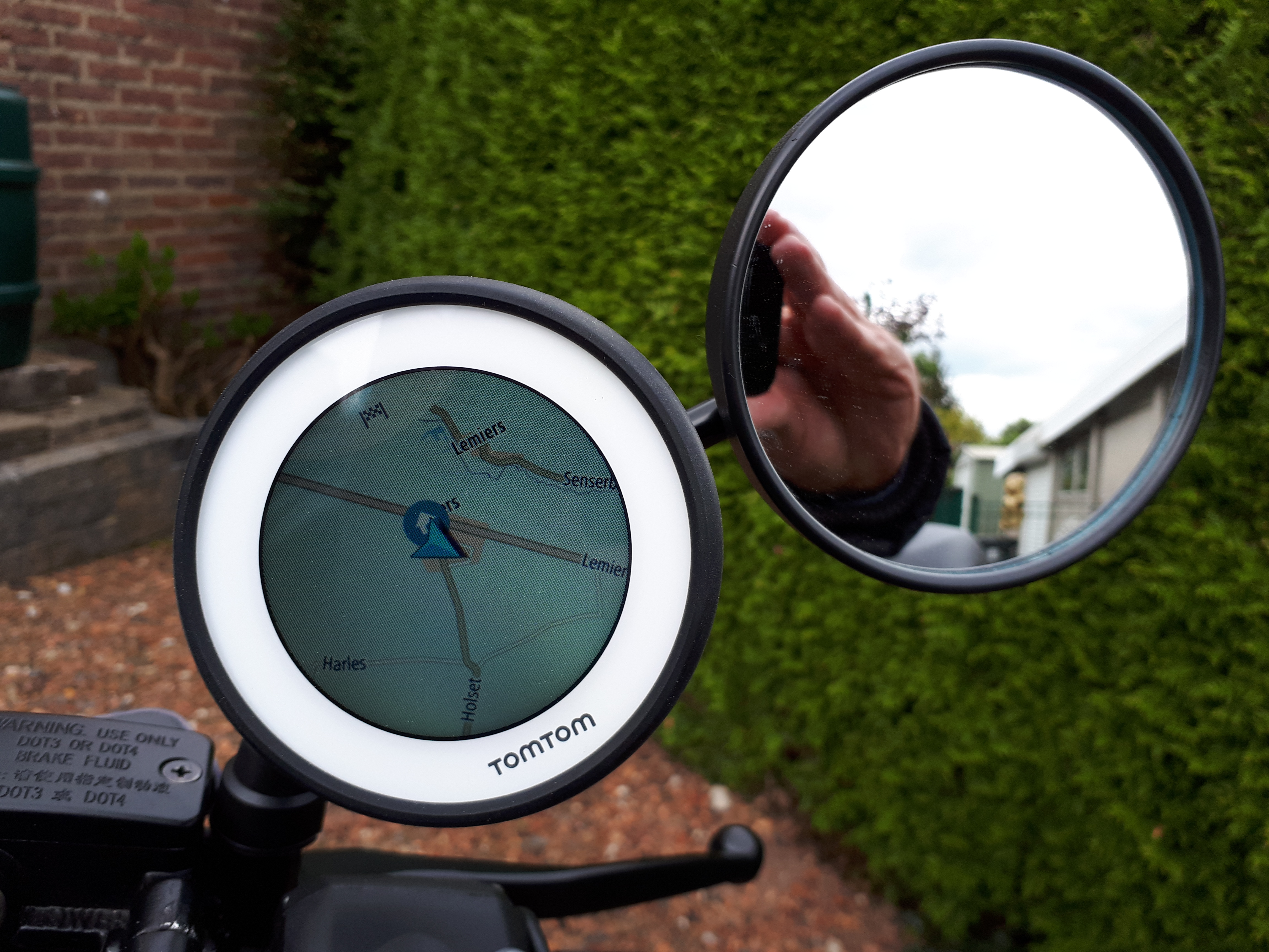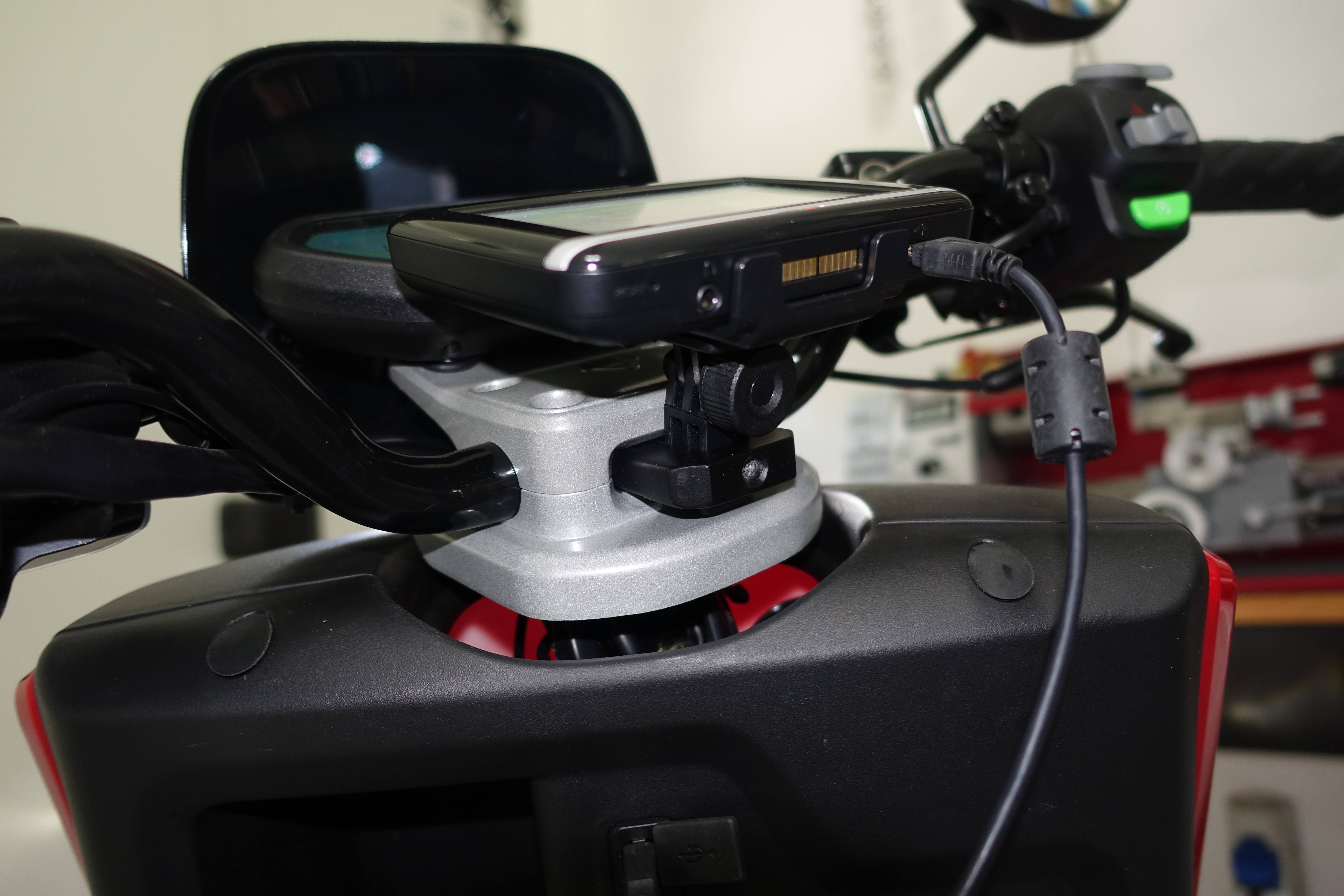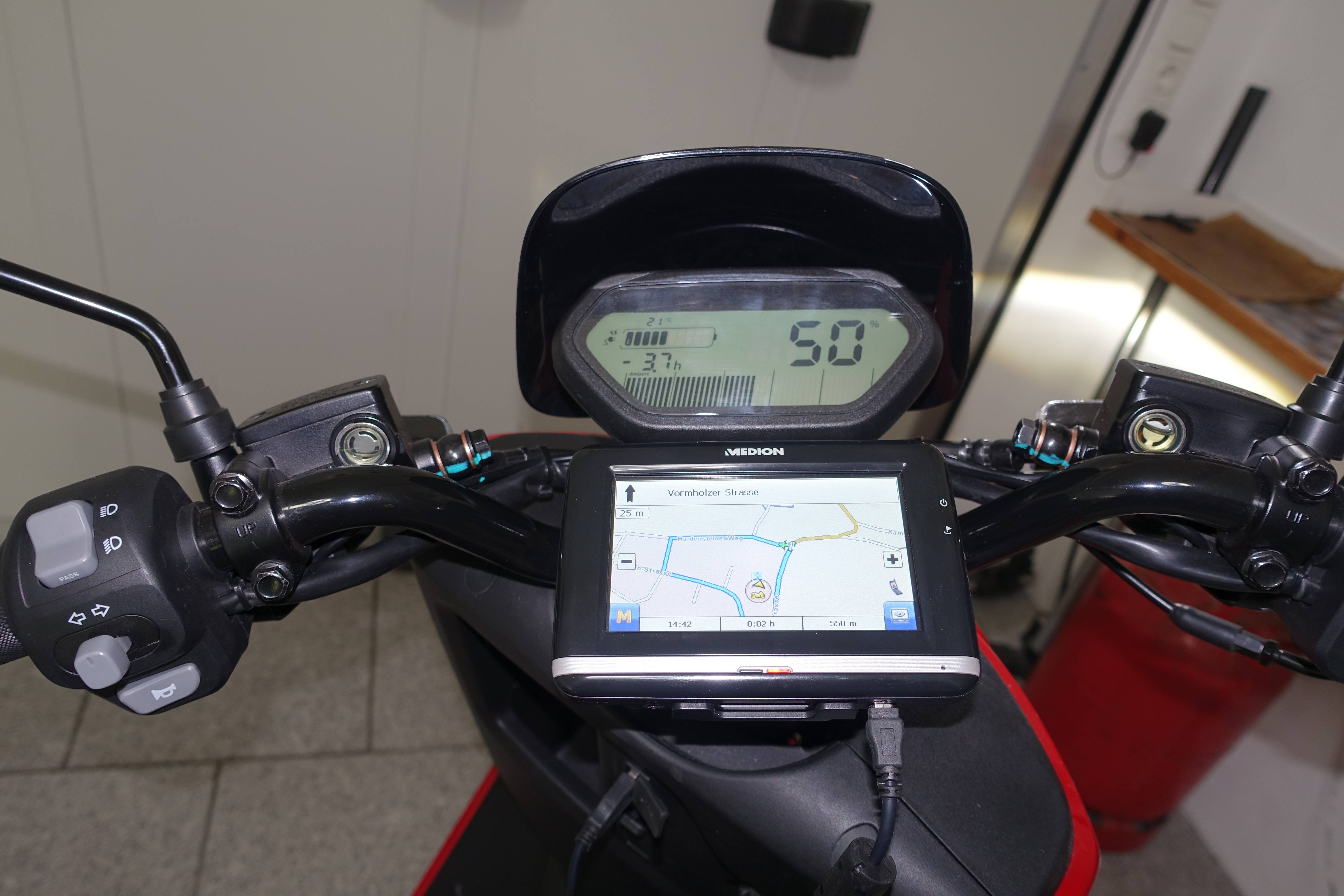 Habe für ein ausrangiertes Medion-NAVI noch Verwendung gefunden. Der Saugnapf wurde duch einen selbstgefertigten Acrylglas-Adapter ersetzt. Befestigung mit einer Schraube. Die mittige Platzierung empfinde ich ergonomisch und gestalterisch idealer als am Lenkerrohr.