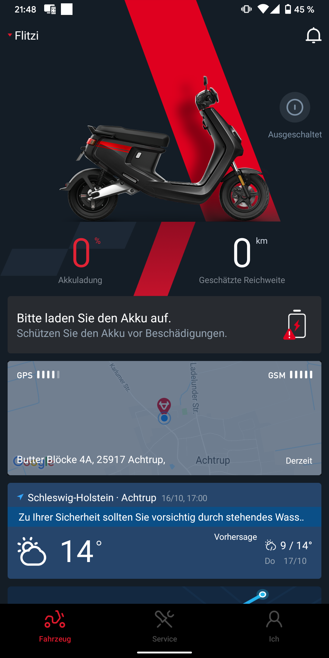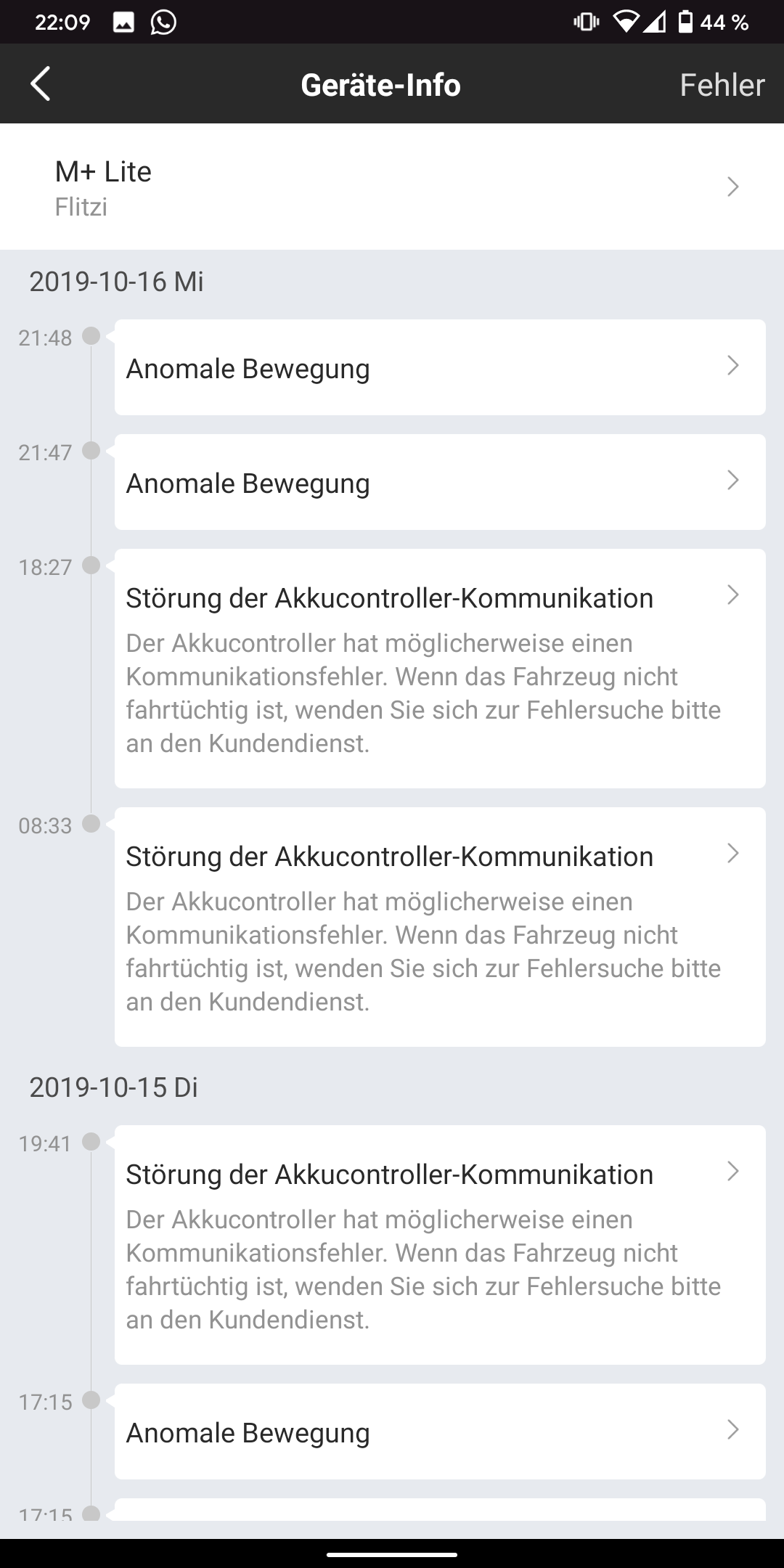 Einige Stunden nachdem ich den Roller ausgeschaltet habe, egal ob der Schlüssel steckt, abgezogen ist, die Alarmanlage eingeschaltet ist und oder das Lenkrad Schloss verriegelt ist, zeigt mir die App den Akku mit 0% an. Der Akku ist natürlich im Roller und angeschlossen. Manchmal erhalte ich bevor das passiert auch eine Benachrichtigung der App mit Fehlermeldung (siehe die beiden angefügten Bilder).