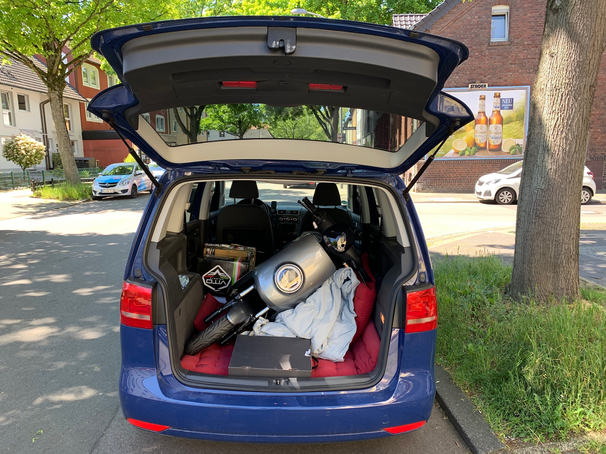 Ja. Ja. Hätte man die Spiegel abgeschraubt, hätte man den M+ auch stehend transportieren können. Aber ich bin schon froh, dass ich nun den Roller selber transportieren kann, wenn notwendig.