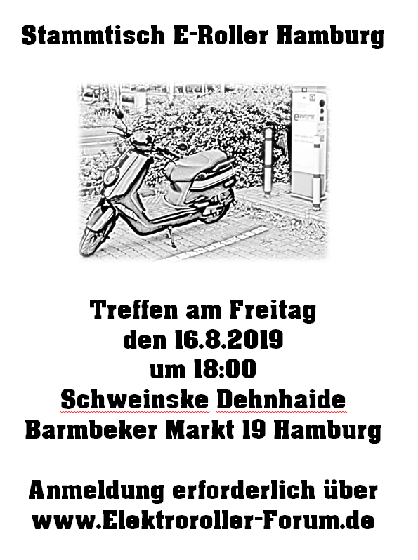 Btw. ich muß mal sehen, wann ich September wieder einen Stammtisch hinbekomme. Vorschläge für Lokalitäten wo man bequem den Roller hinstellen kann und vielleicht sogar laden?
