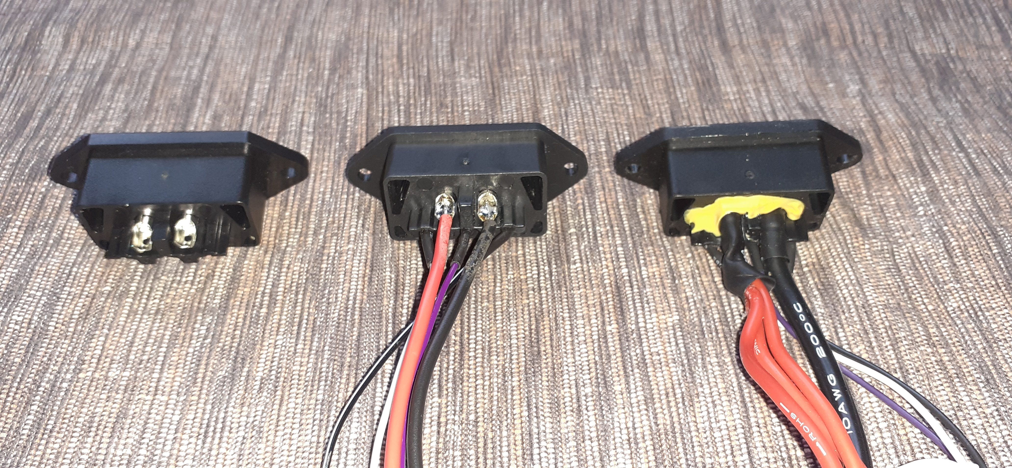 Also ich habe eine Akku-Buchse samt Kabeln in gutem Zustand (siehe Bild; Rechte Buchse) und fünf mt60 Stecker besorgt (wie ein XT60 Stecker mit drei Hülsen). Also auf den Fotos sieht man drei verschiedene Stecker. Einmal blanko ohne Kabel, einmal ein original Ersatzteil für die Ladebuchse, wobei aber die Verkabelung komplett geändert werden müsste, damit sie zu den Akku-Innereien passt, und ein originaler Akku-Stecker inklusive kompletter Verkabelung (auch RST(?)-Stecker und Kabel, worüber ich auch froh bin denn diese sind sehr klein).