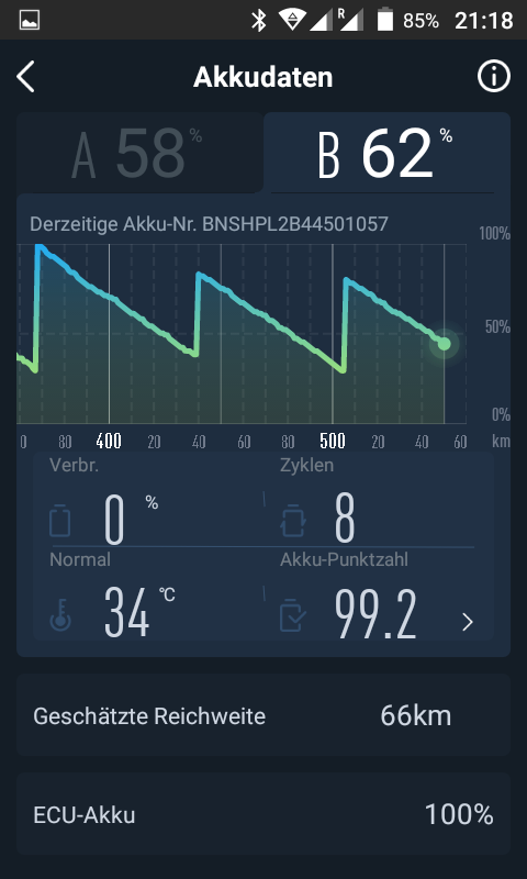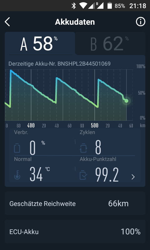 Akku A (unter dem Fussraum) zeigt in der App 100% (bei abgezogenem Akku B auch im Display am Roller), Spannung: 68,2 V
