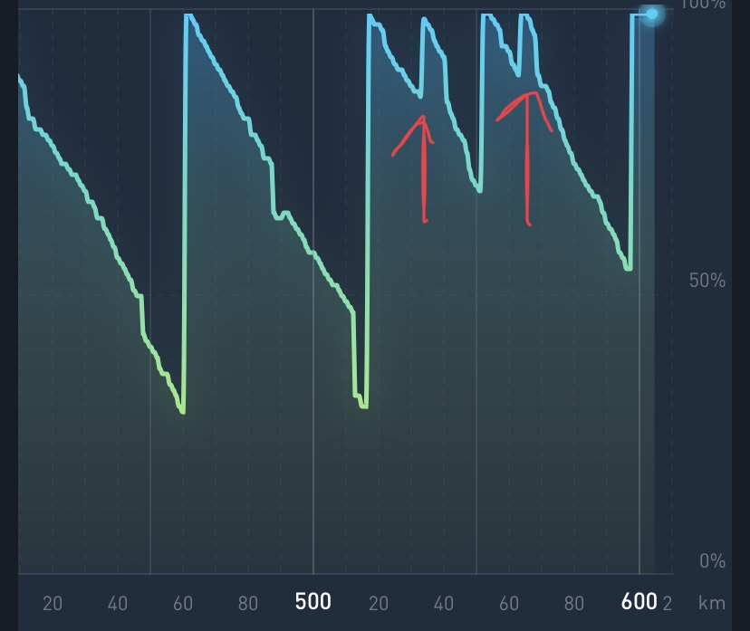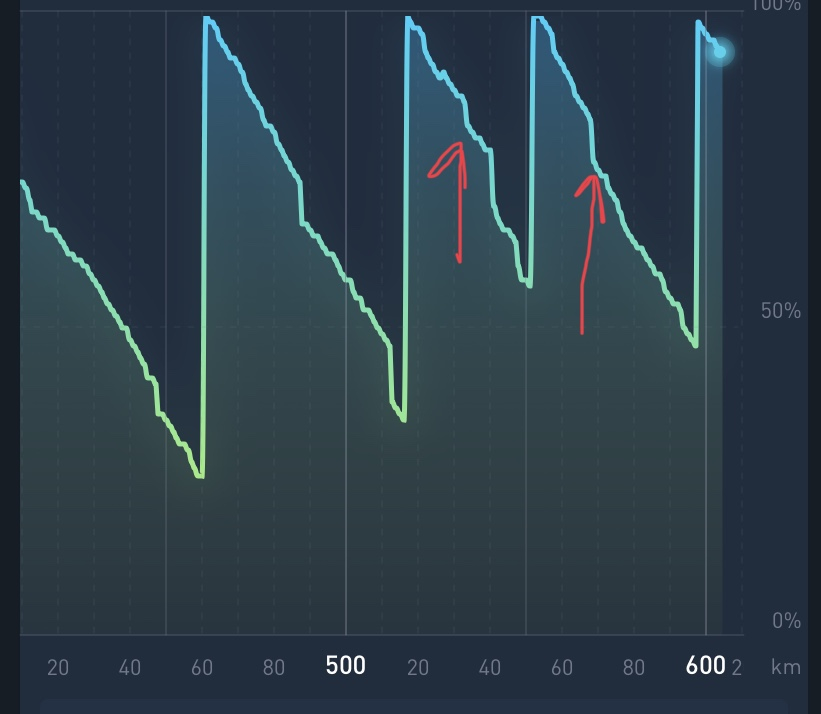 Wobei hier fällt mir schon auf, dass die ersten 40km deutlich weniger als 1% der Batterieleistung je km "kosten", je niedriger der Batteriestand wird, desto schneller läuft der %-Zähler (bezogen auf die gefahrenen km), das ist aber vermute ich ein "normales" Batterieverhalten bzw. eine Frage der laufenden Messung.