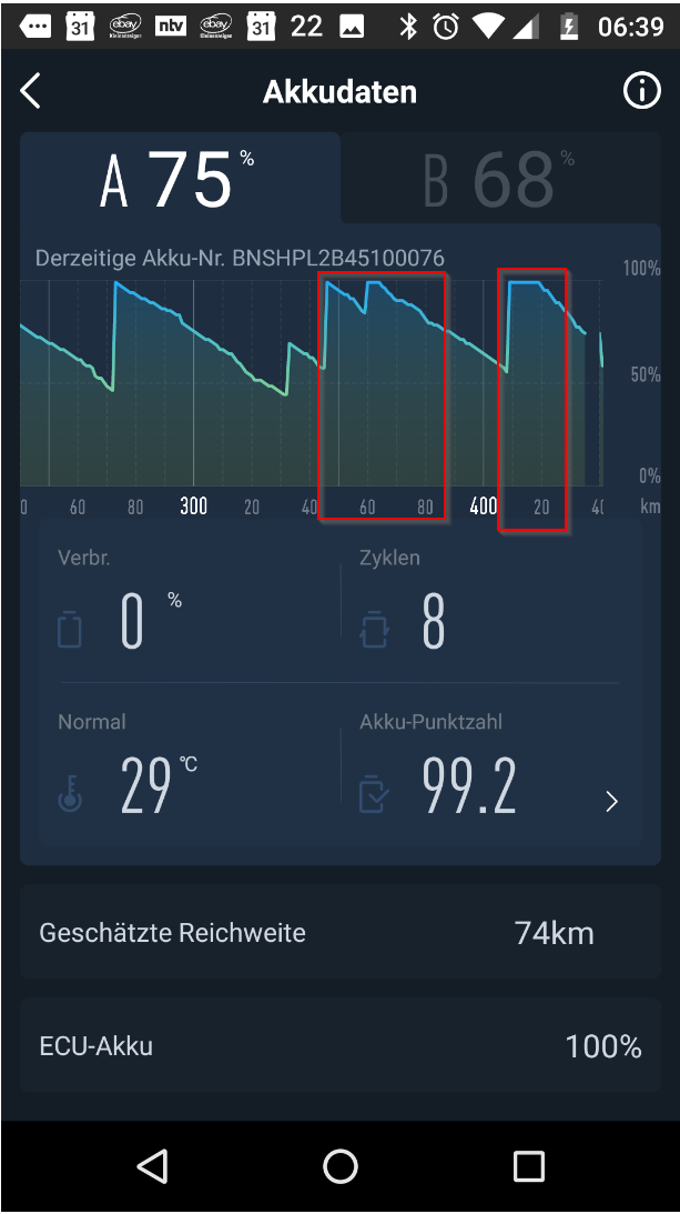 hast du die beiden Akkus einmal jeden einzeln geladen? dann könnte man das besser erkennen, denke ich!Mr.Eight hat geschrieben: ↑Mo 29. Apr 2019, 15:05Ich habe jetzt Germany@Niu.com geschrieben... Noch etwas detaillierter als hier. Ich bin doch überrascht, was ich gestern bei Laden gesehen habe. Aber wie gesagt... Muß ich noch zusammenschneiden. Soviel kann ich schon mal sagen... Auch wenn der Akku beim Laden nicht mehr blinkt sondern 5 stehende LEDs anzeigt... ist der Akku im Zweifel noch lange nicht geladen... und das zeigt auch der Bogen in der Grafik wenn man genau hinschaut, wo die Unterbrechungen sind. Die Akkus wurden vom Ladegerät getrennt als die Leds zum Stillstand kamen... Aber der Akku B hatte nur gut 90%!!! wohingegen der Akku A 100% hatte.