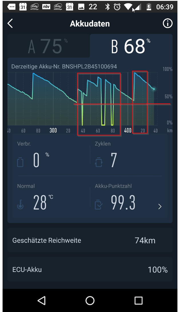 Edit. Mir fällt ein, die Einbrüche sind vom Anpaßversuch, die Ladestände während der Fahrt anzugleichen, Da habe ich bei der Fahrt den Akku B immer Mal abgeklemmt um auf den gleichen Prozent von Akku A zu kommen, was aber keinen Erfolg auf Dauer hatte, da dann Akku B schnell wieder die Differenz aufbaute.