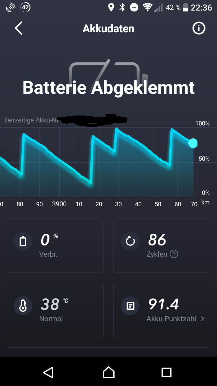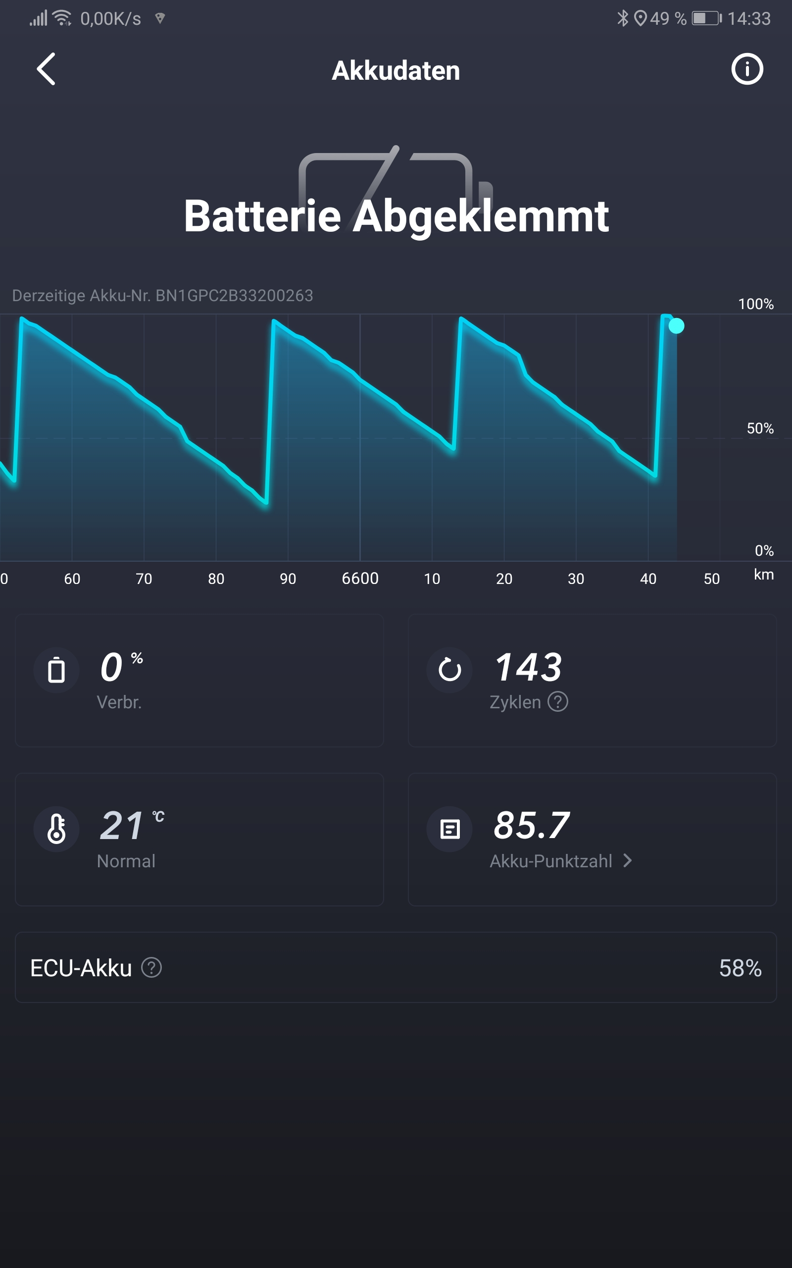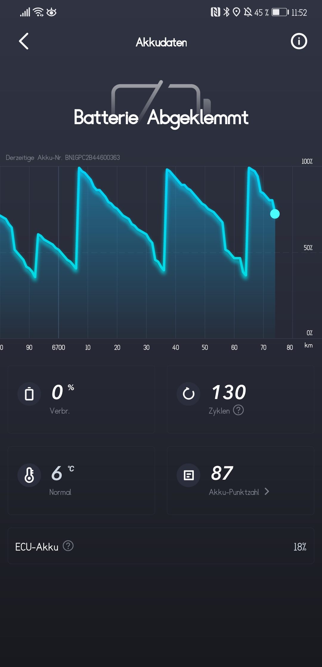 Also gut, ich biete 8824 km, ohne Appanbindung, daher keine Ladezyklen. Ggflls , wenn gewünscht ein Foto.