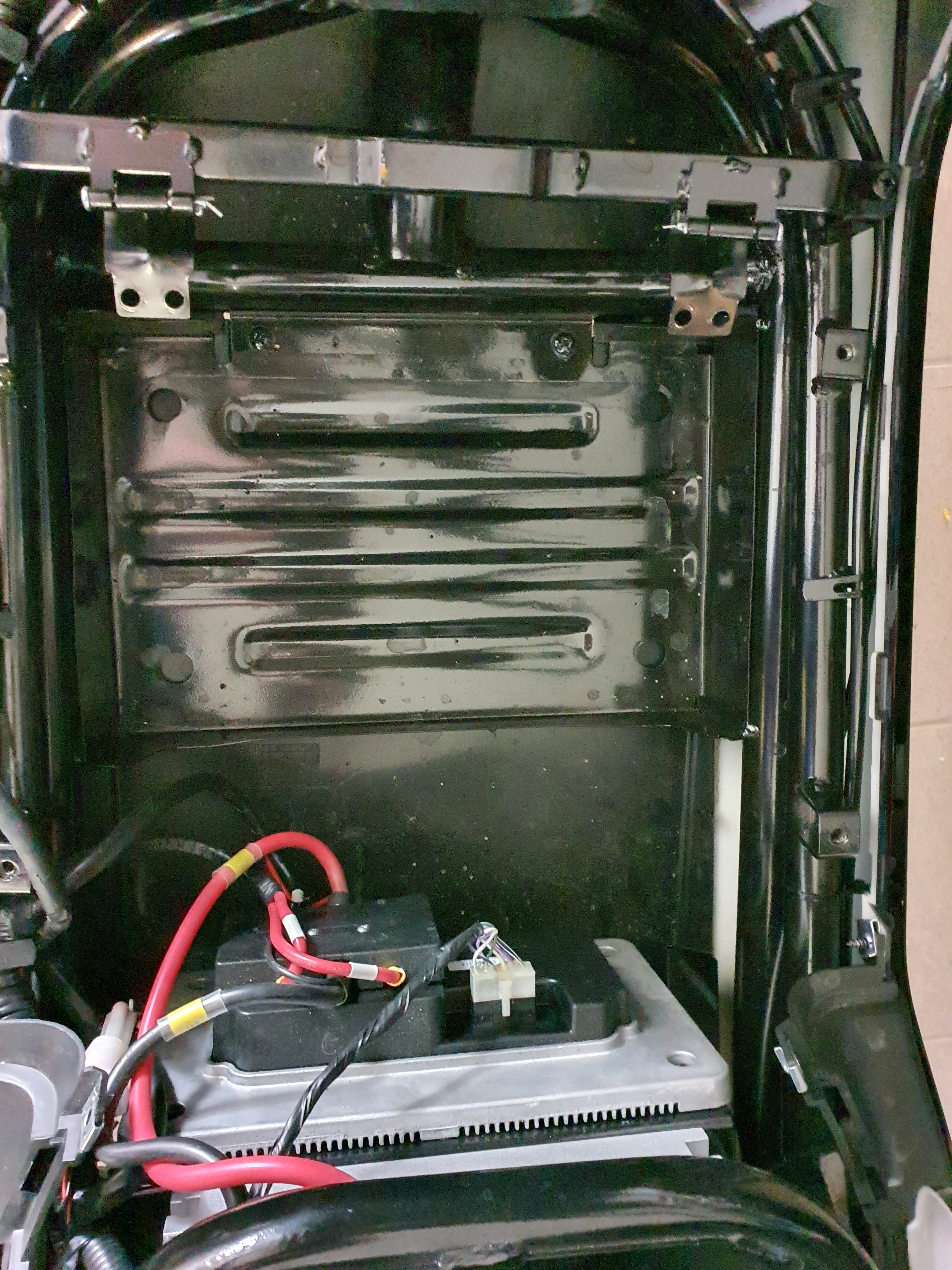 Hallo, die Verkleidungen sind kein Problem, erst die Abdeckung am Fussbereich, um die ganz wegzubekommen musst du die Scharniere noch lösen , das sind 4 extrem fest eingeklebte Kreuzschlitzschrauben, erst wenn der Akkudeckel weg ist kann man die Abdeckung des Fussraumes ausklinken. Aber,und das hat nirgendwo gestanden, man soll das Blech welches unter dem Kunstoff–Akkubehälter ist herausflexen? Das ist aber mit dem Rahmen verschweißt! Bin mir nicht sicher ob das keine stabilisierende Funktion hat. Also ich werde das lassen, die Idee ist gut, aber die Umsetzung ist sehr schlecht, es ist keine Anleitung dabei und der Controller mitsamt Kühlkörper muss versetzt werden, der Kühlkörper soll sogar nur zwischen Kunststoff und neuer Akkubox eingeklemmt werden. Das Bild hier hat mir Salvatore geschickt: