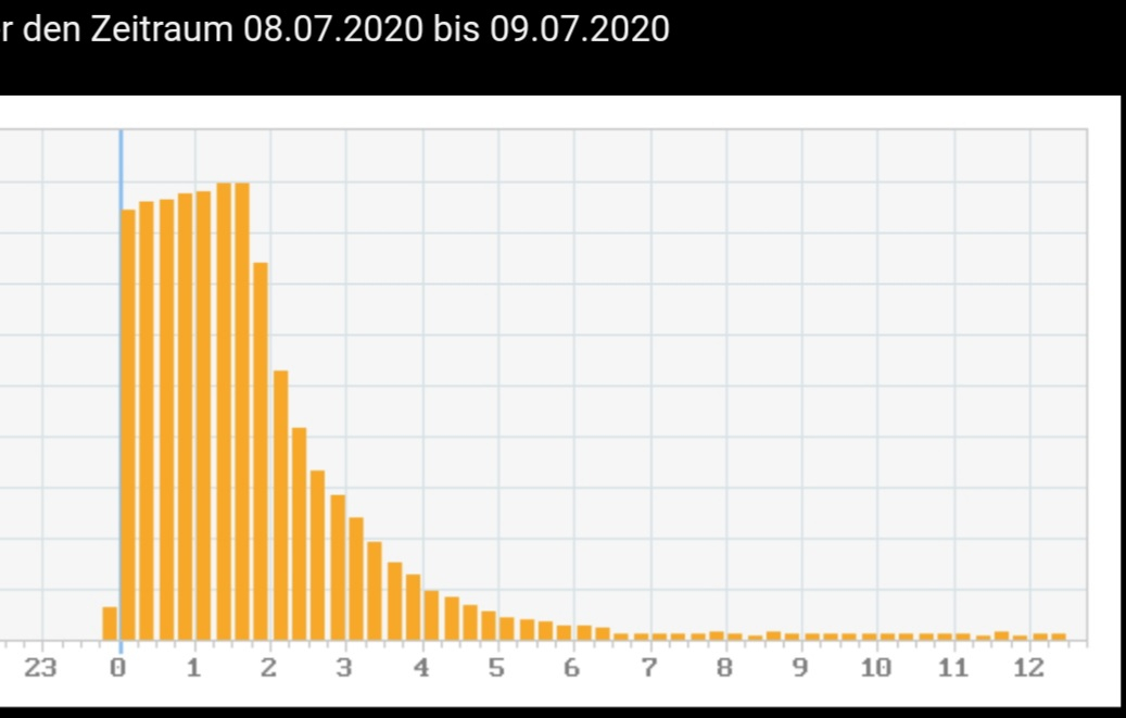 Trotzdem hat er seeehr lange gebraucht bis er unter 10W fiel: Eigentlich war er ja schon um 7 Uhr auf ein sehr niedriges Niveau gefallen, was sich kaum noch änderte ...