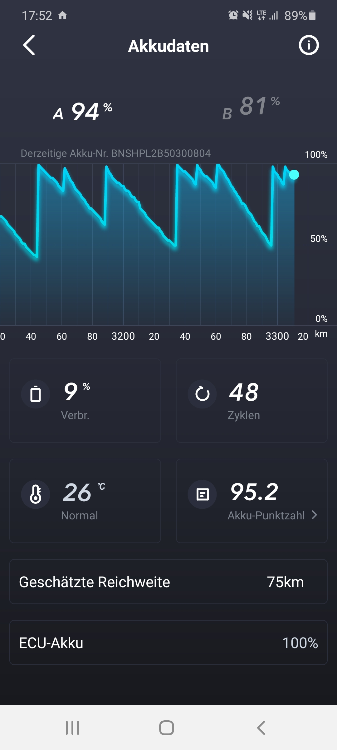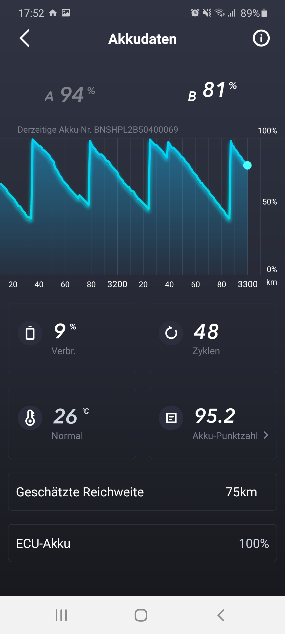 Jedenfalls hat sich bei mir trotz jetzt schnellerem Roller der Verbrauch minimal reduziert. Kann natürlich auch am jetzt warmen Wetter liegen, aber während ich vorher knapp über ein Prozent Akku pro km brauchte, ist es jetzt knapp unter einem Prozent und das obwohl ich die gesamte Strecke im Sportmodus, 2/3 davon Überland fuhr.