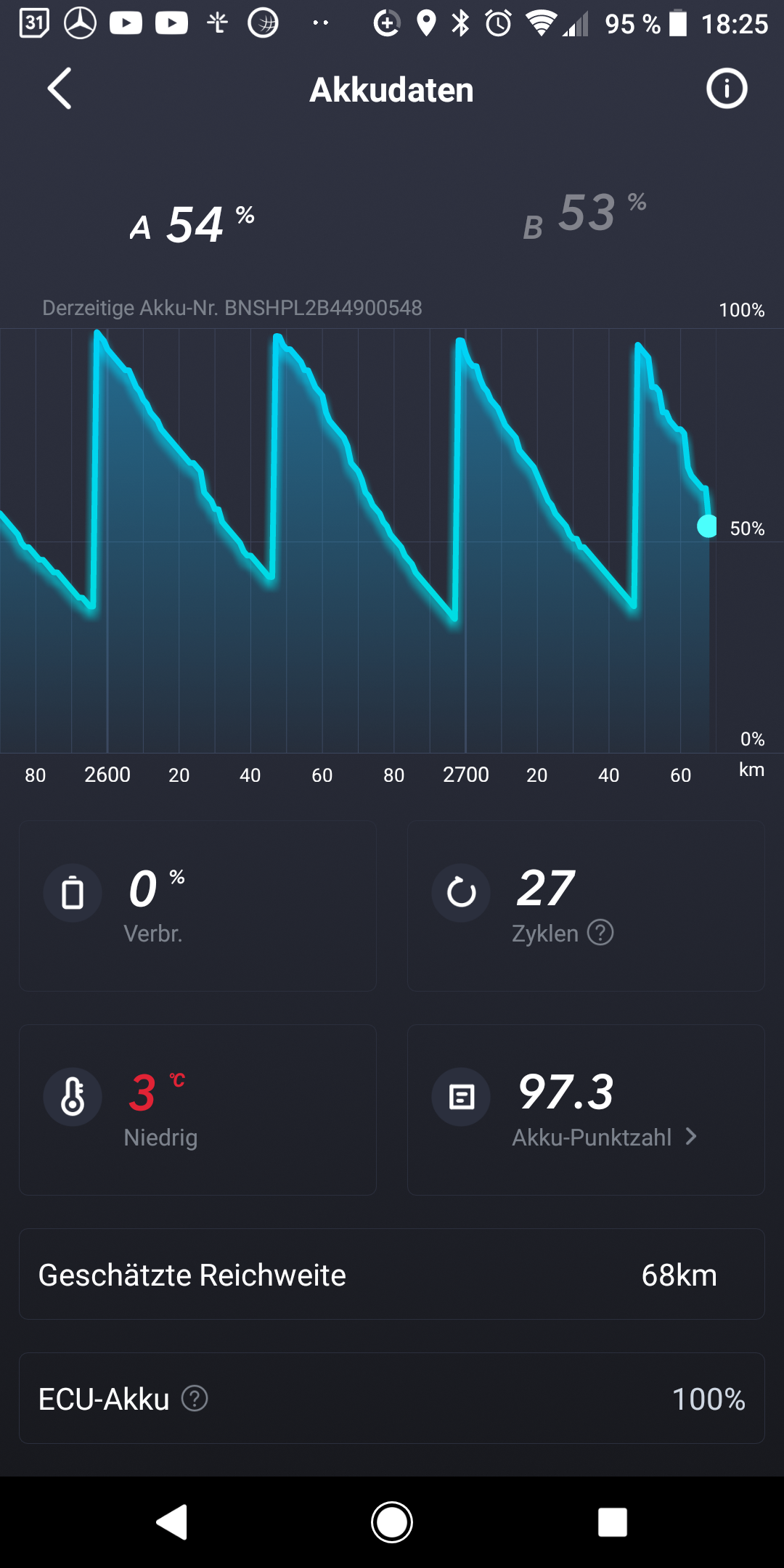 Nun habe ich die beiden Akkus 5 Tage draussen gehabt. Der ECU Akku zeigt in der App nach Wiederanschließen der großen Akkus 1% Restladung an. Mit den vollen Hauptakkus bin ich 30km gefahren, zwischenzeitlich 4h Pause - also gute 5 Stunden waren die Akkus drin und konnten den ECU Akku aufladen. Aber nach diesen 5 Stunden war der ECU Akku erst bei 2% Restladung angekommen :o