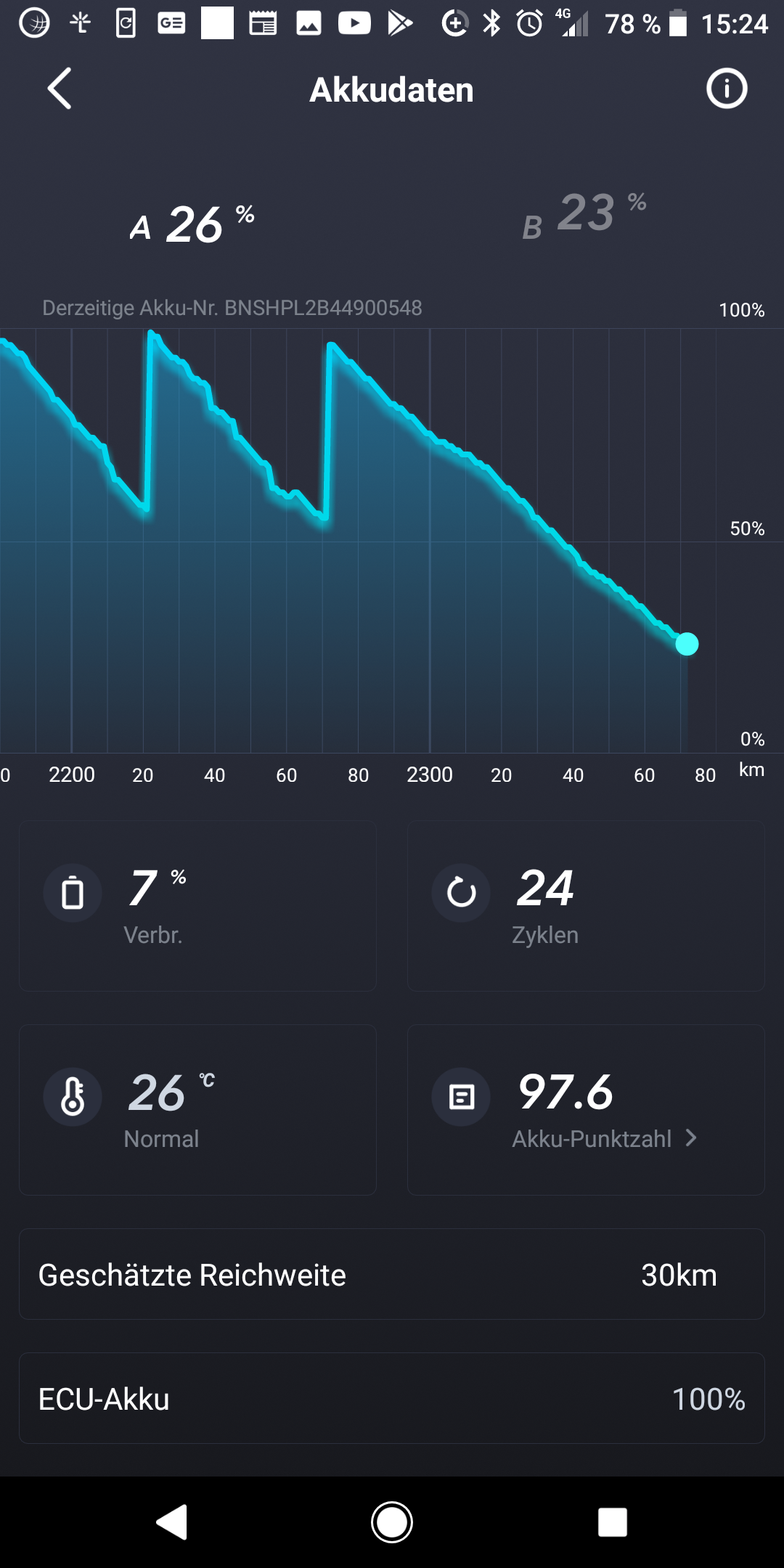 Ich hab am mittwoch vergangener Woche den Roller geladen, bis auf 98 % ( zu mehr hat die Zeit nicht gereicht ) und hab dann eine längere Strecke von 78 km gefahren. Über Kreisstrassen, geteerte Wingertwege und Bundesstrassen 40 km hin und 38 zurück bei einem Verbrauch von 57 % Akkuleistung. Alles im Sportmodus aber logischer Weise nicht immer am Anschlag ! Dann hab ich von Do bis heute früh durch kürzere Fahrten, die allerdings alle im Dynamik-Modus, die 100 km Strecke vollgemacht und hab noch 25 % Akku ! Ein bisschen Drift zwischen A und B das werden aber bei dem niedrigen Ladungsstand nur wenige Millivolt sein, ich habs nicht gemessen !
