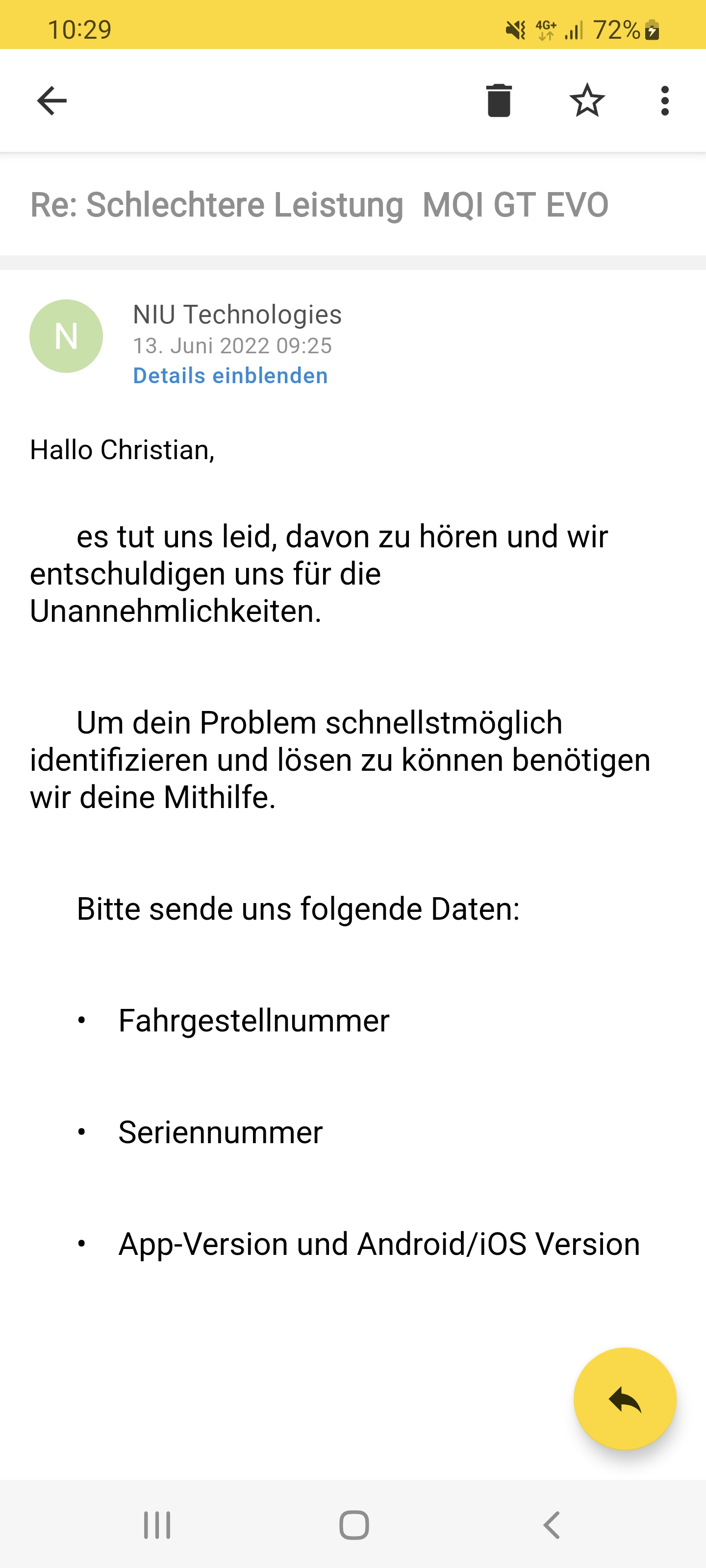 Niu hat mir in der Zwischenzeit genau die gleiche Mail geschickt
