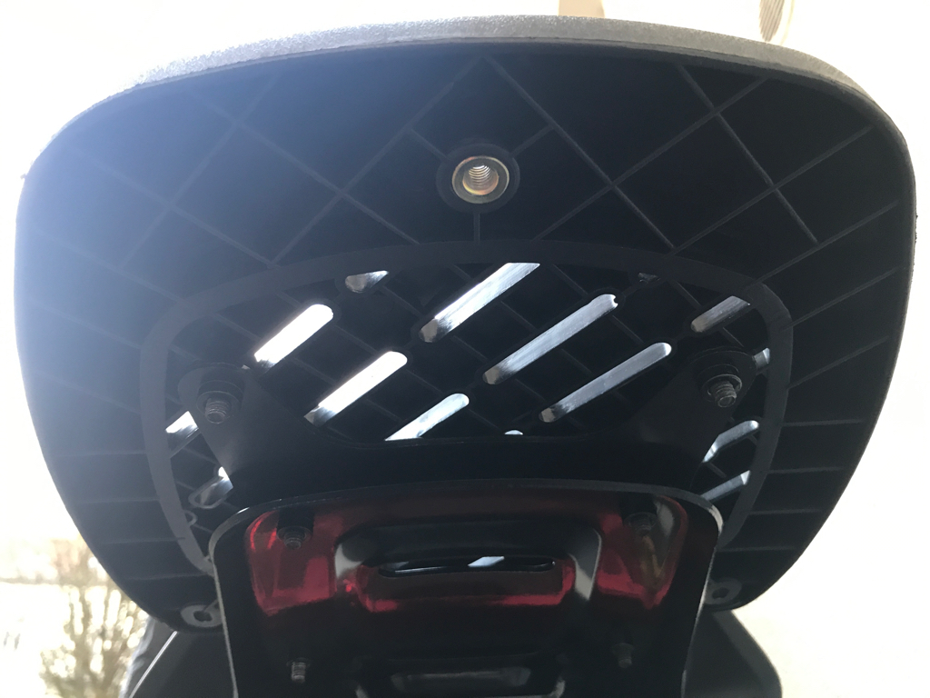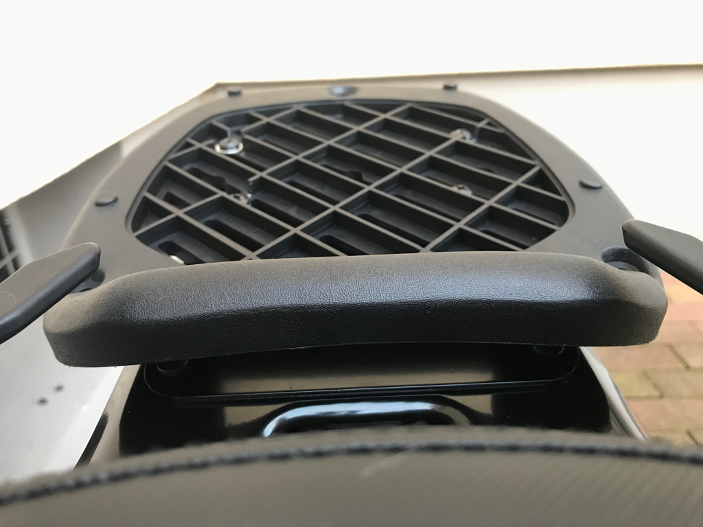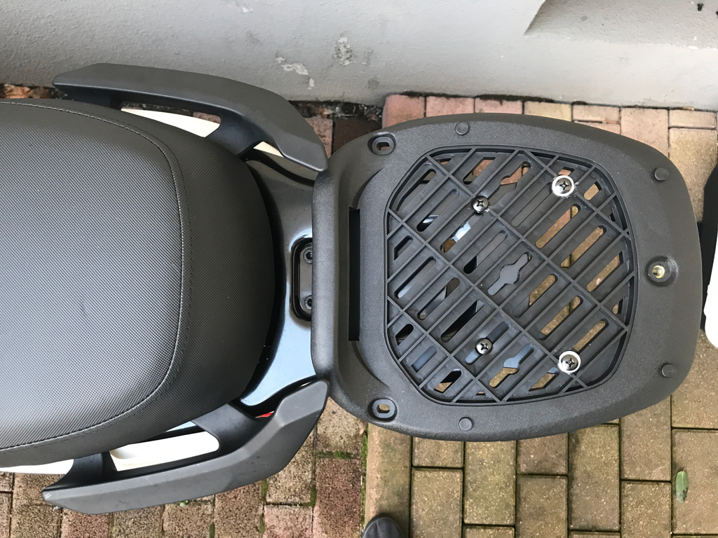 Der originale, H-förmige Verlängerungsaufsatz wird hierfür benötigt, damit die Grundplatte zumindest in der Mitte gehalten wird. Hier konnte ich nur zwei der vorhandenen Bohrlöcher der Topcase-Grundplatte verwenden, der Rest musste hineingebohrt/geschnitten werden (das Plastik ist aber relativ weich): Die (in Fahrtrichtung) vordersten Schrauben halten nur den Verlängerungsaufsatz auf dem Träger, nicht aber die Grundplatte an sich: Von unten sieht das Ganze so aus. Die (in Fahrtrichtung) hinteren Schraubenpaare halten die Grundplatte auf dem Träger : Und das Endergebnis sieht dann so aus. Die "Hörner" haben nur minimalen Abstand zum Topcase. Das Ergebnis sieht wie ich finde sehr in Ordnung aus