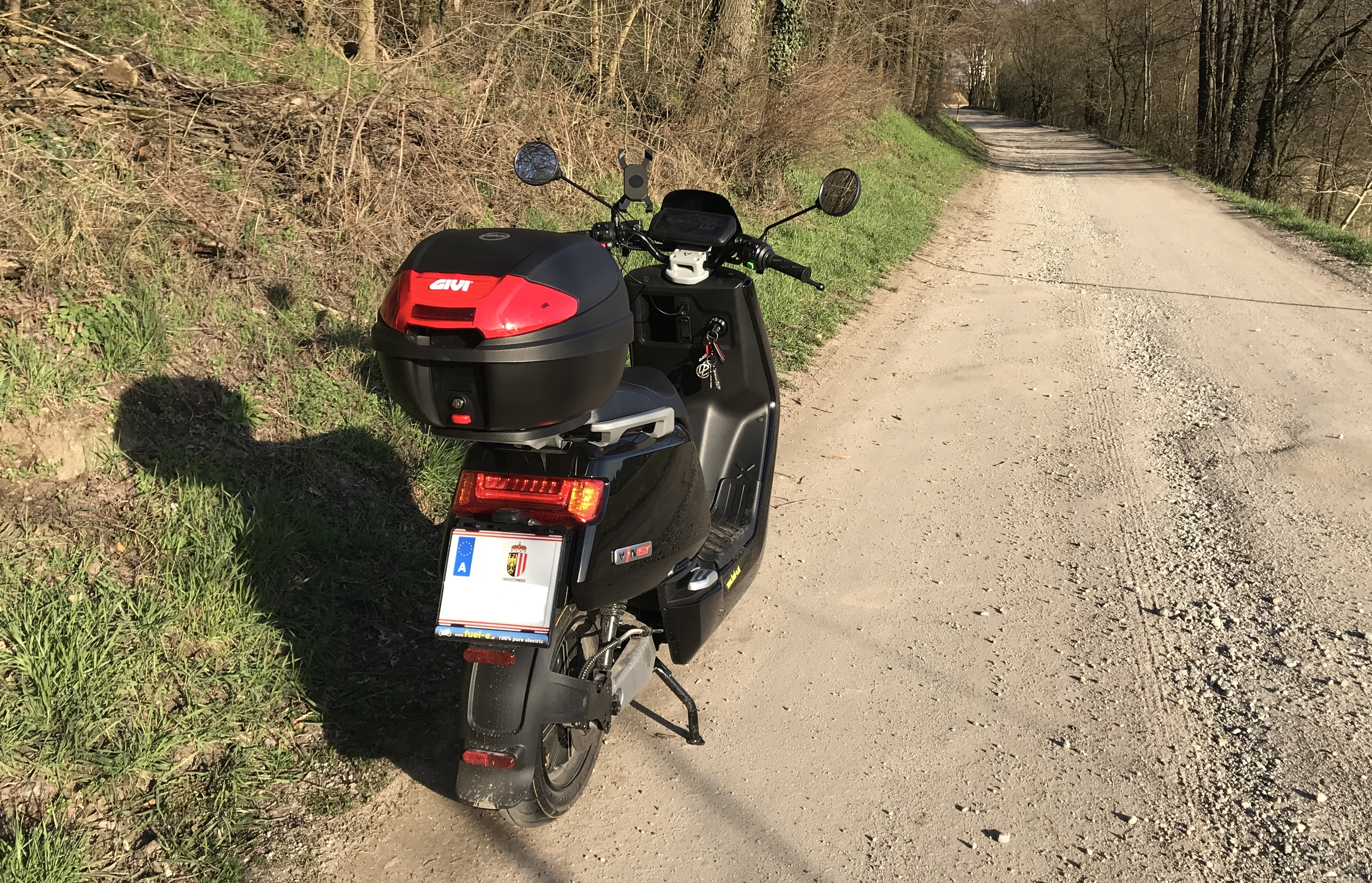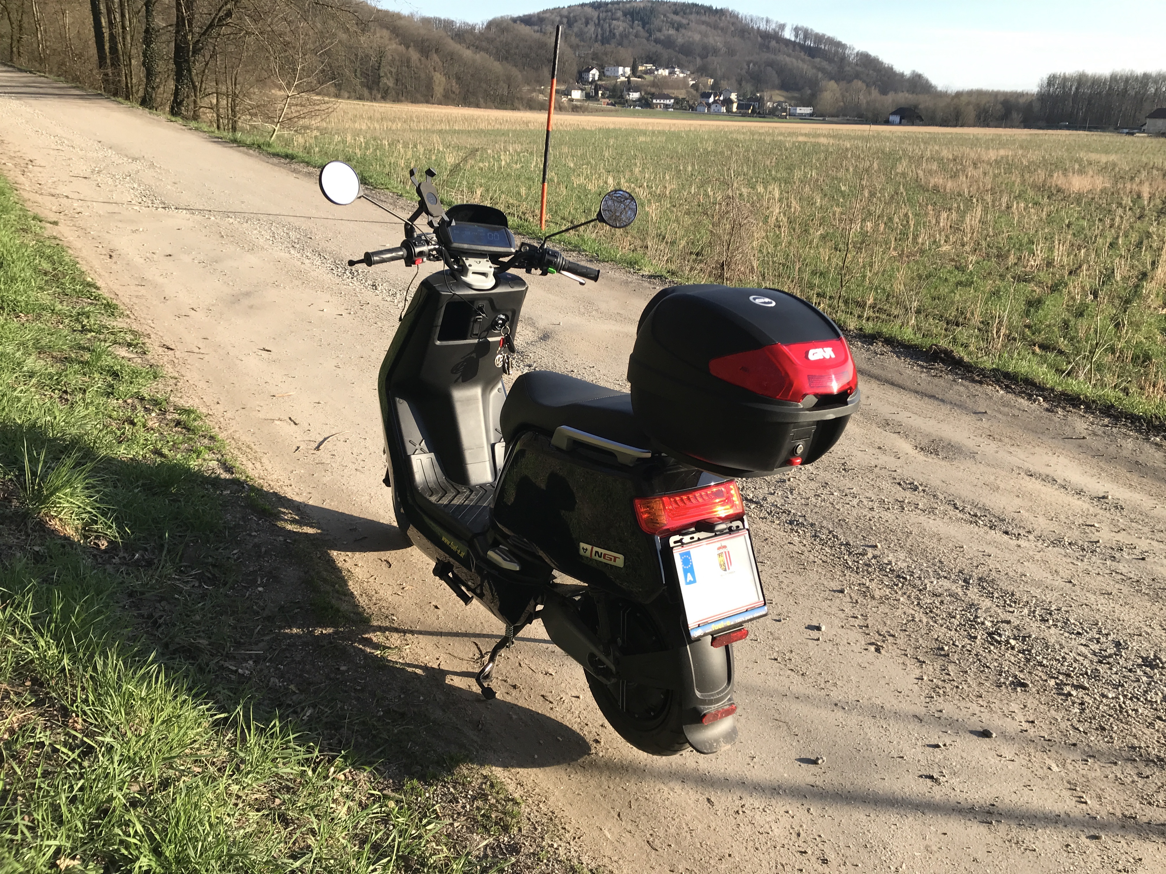 Wie ich finde passt es perfekt zu meinem schwarzen N-GT. Die Montage war schnell und problemlos, da das Teil genau auf die Bohrungen am originalen NIU-Topcasehalter aus dem Geschenkset passt. Die Breite entspricht ziemlich genau der des Rollers, also nicht zu groß, aber ein Helm passt locker rein. Aja, und die "guten" Louis Spiegel hab ich auch dran...