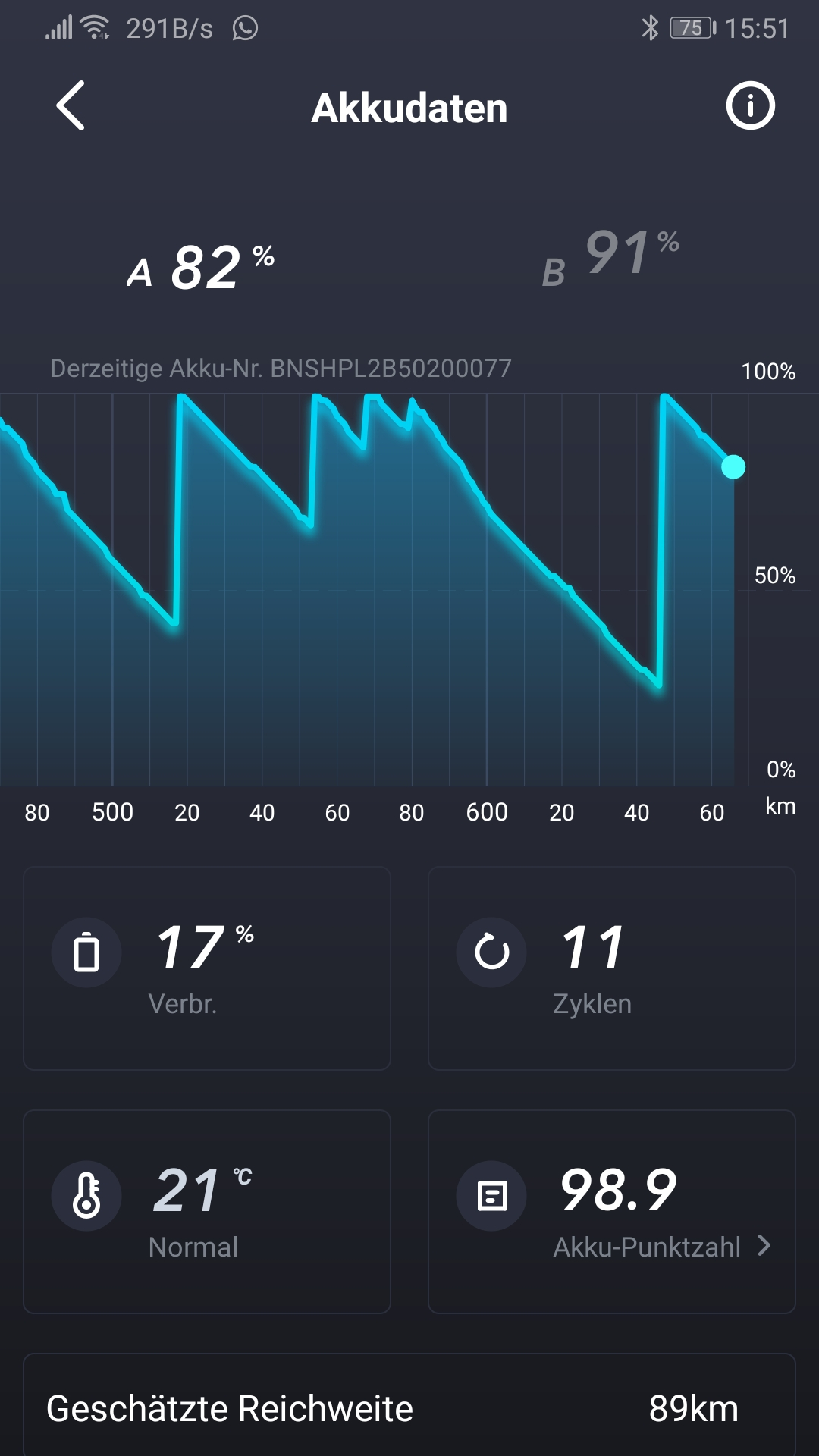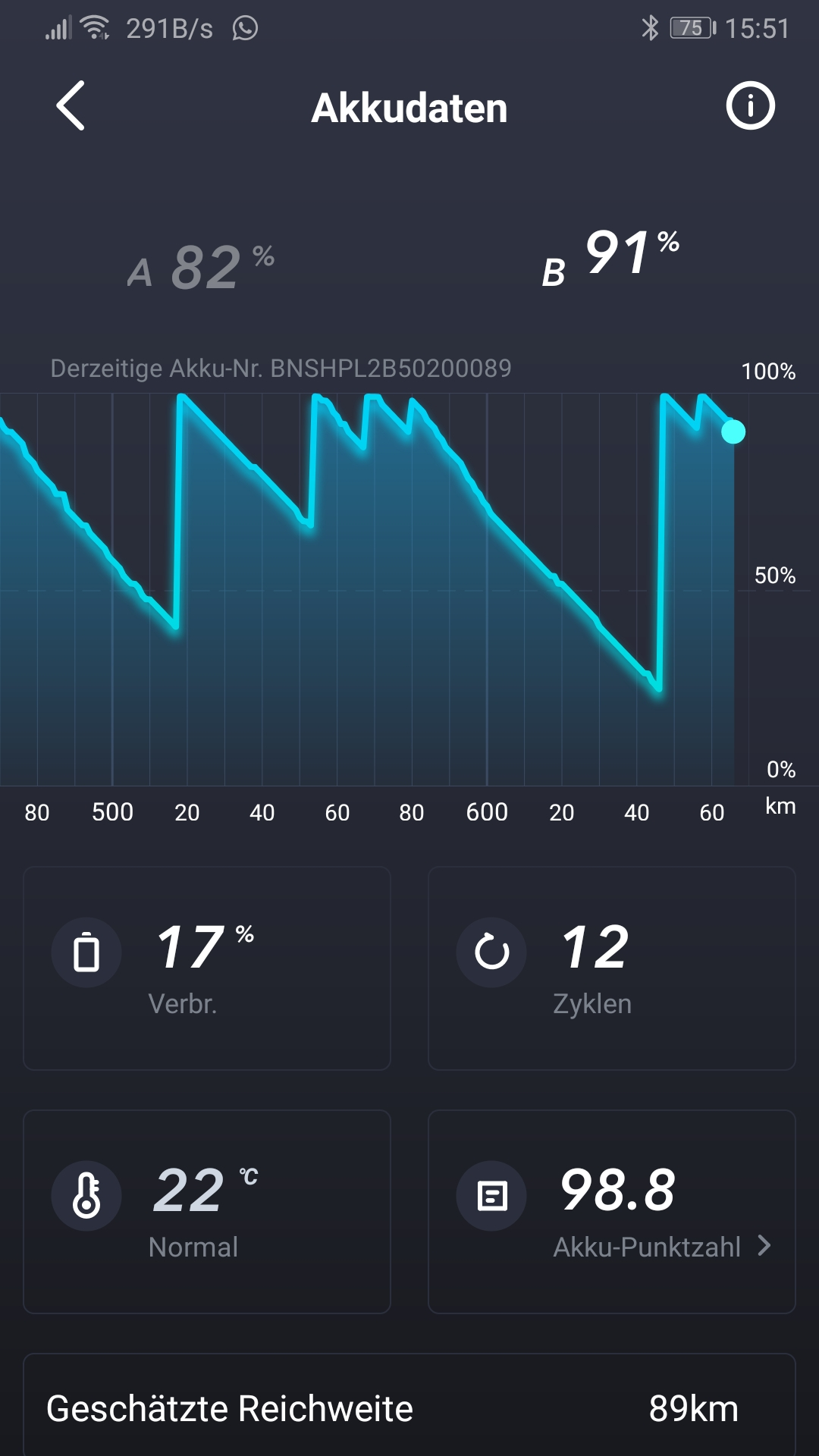 Da wir alle gelegentlich mal das Driften beobachten, wird die SOC nicht (allein) über die Spannung ermittelt. Ebenso kennen wir, dass ein geparkter Roller gerne mal 3-5% Ladung "verliert", bzw. die Entladekurve in der App steil nach unten geht. Diese 3-5% innerhalb von einigen Stunden sind auch nicht ausschließlich auf Selbstentladung zurückzuführen, die ist erheblich geringer. Ich meine auch, je nach Jahreszeit / Außentemperatur unterschiedliche "Verluste" zu sehen.
