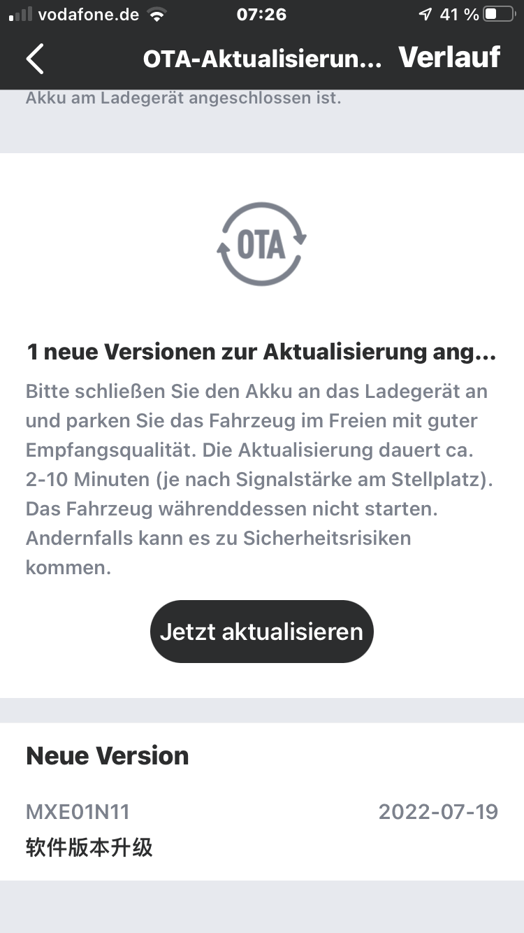 Kannst du mal schauen was in der App jetzt für eine Firmware angezeigt wird?dandylam hat geschrieben: ↑Do 11. Aug 2022, 13:32Gestern (10.08) erhielt ich einen Anruf meines Händlers mit der Nachricht, dass mein EVO wieder fahrbereit ist.
