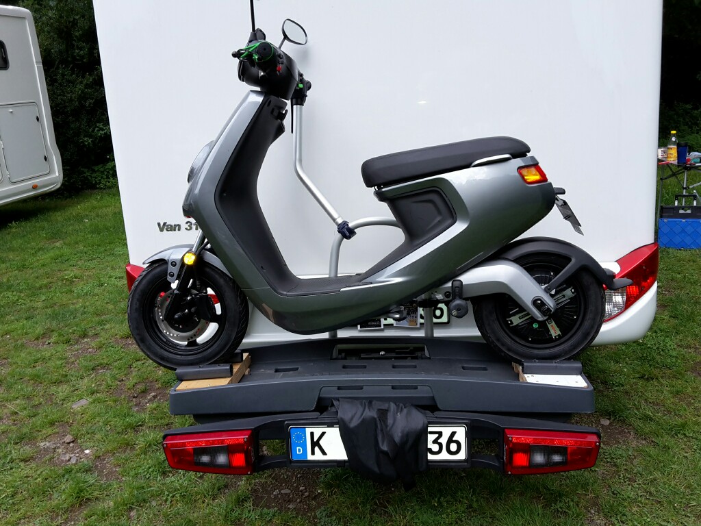 Der Roller steht leicht versetzt nach links auf der Plattform, um den Rollerschwerpunkt mehr in die Mitte zu platzieren. Das Hauptgewicht stellt der Elektromotor dar, die aufliegende Last ist rechts also größer.