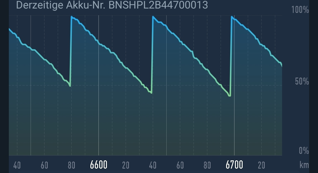 Leider konnte ich sie im Spritmonitor nicht so einfach erfassen, weil ich nur noch Teilladungen mache und dann im Kopf addiere. Da ich den Akku einmal auf 60% nachlade und dann irgendwann bei Bedarf auf 100%. Und dann hatte ich es vergessen einzutragen.