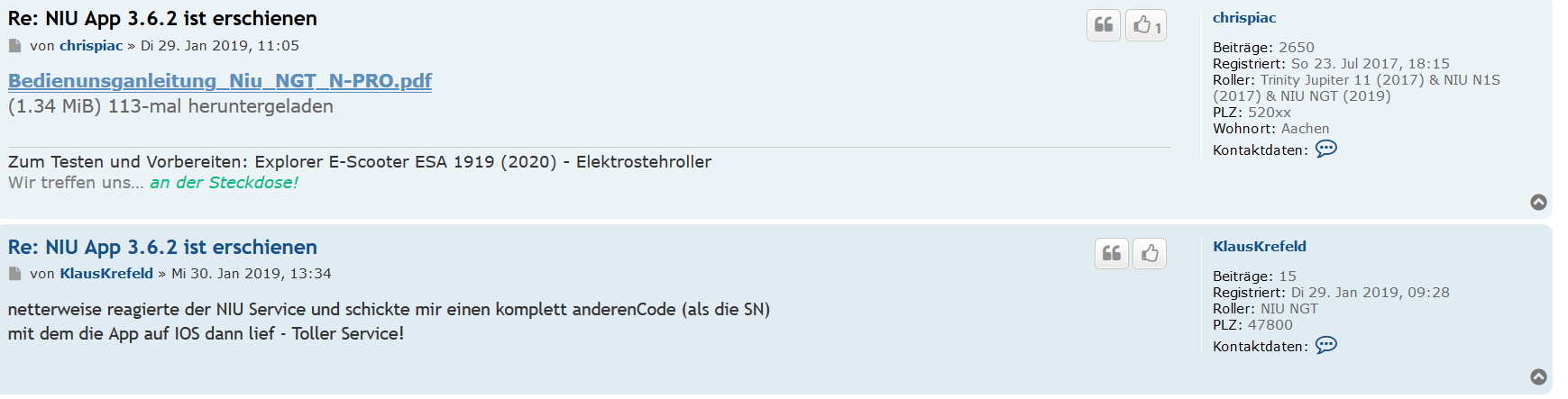 questions@niu.com gepostet, dort erhielt ich lediglich die Auskunft, dass der Akku in einem solchen Falle leer sei und nachgeladen werden müsse.....