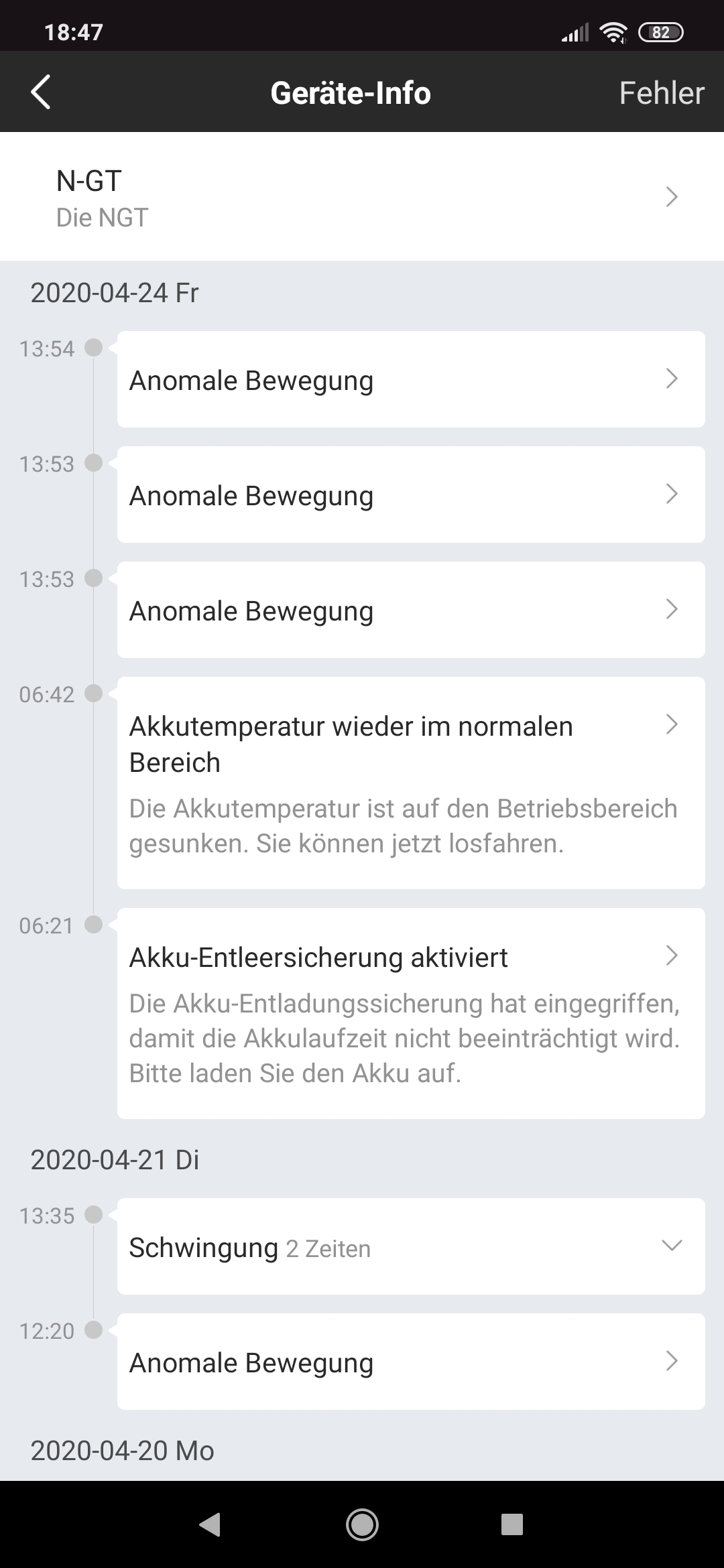 Die Meldungen sind manchmal, hmm, "spannend". Ich finde bei mir z.B. Einträge, Akku abgeklemmt (habe ich tatsächlich), und ein paar Sekunden meldet das System "Akkustand niedrig, zur Vermeidung irreversibler Schäden blabla". Die Meldungen nehme ich nicht mehr ernst, außer wenn unvermittelt die Meldung kommt "Akku voll", auch wenn ich den Roller mit 95% Ladezustand einfach nur so abgestellt habe, dann weiß ich, jetzt mach mal wieder eine ausführliche Ladungen zu Balancieren, weil das BMS mal wieder die Kennlinie versaubeutelt hat.