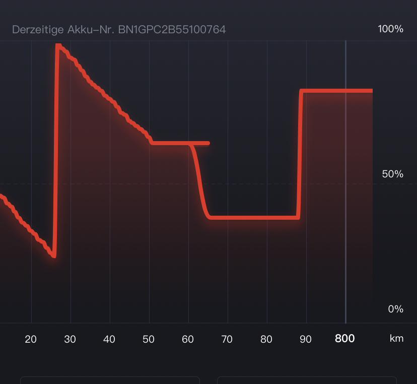 Diese „Zacken“ sind ganz normal! Niu hat ja in der App in der x-Achse von Zeit auf Kilometer umgestellt (kann man ja unten bei der Kurve ablesen). Gerade wenn man noch die B03 „drauf“ hat, verbraucht die ECU im Stand Energie, die ja aus dem Akku gespeißt wird. So fällt der Akkustand entsprechend einige Prozent im Stand ab. Genau das wird angezeigt und ist auch richtig, wenn die Akkus über Nacht oder am Arbeitsplatz etc. im Roller verbleibt. Ebenso senkrecht nach oben sieht dann auch eine Akkuladung aus, wenn sie im Roller erfolgt, der Roller steht (fährt also keine Kilometer auf der x-Achse) und der Ladestand steigt, => senkrechte Linie nach oben.
