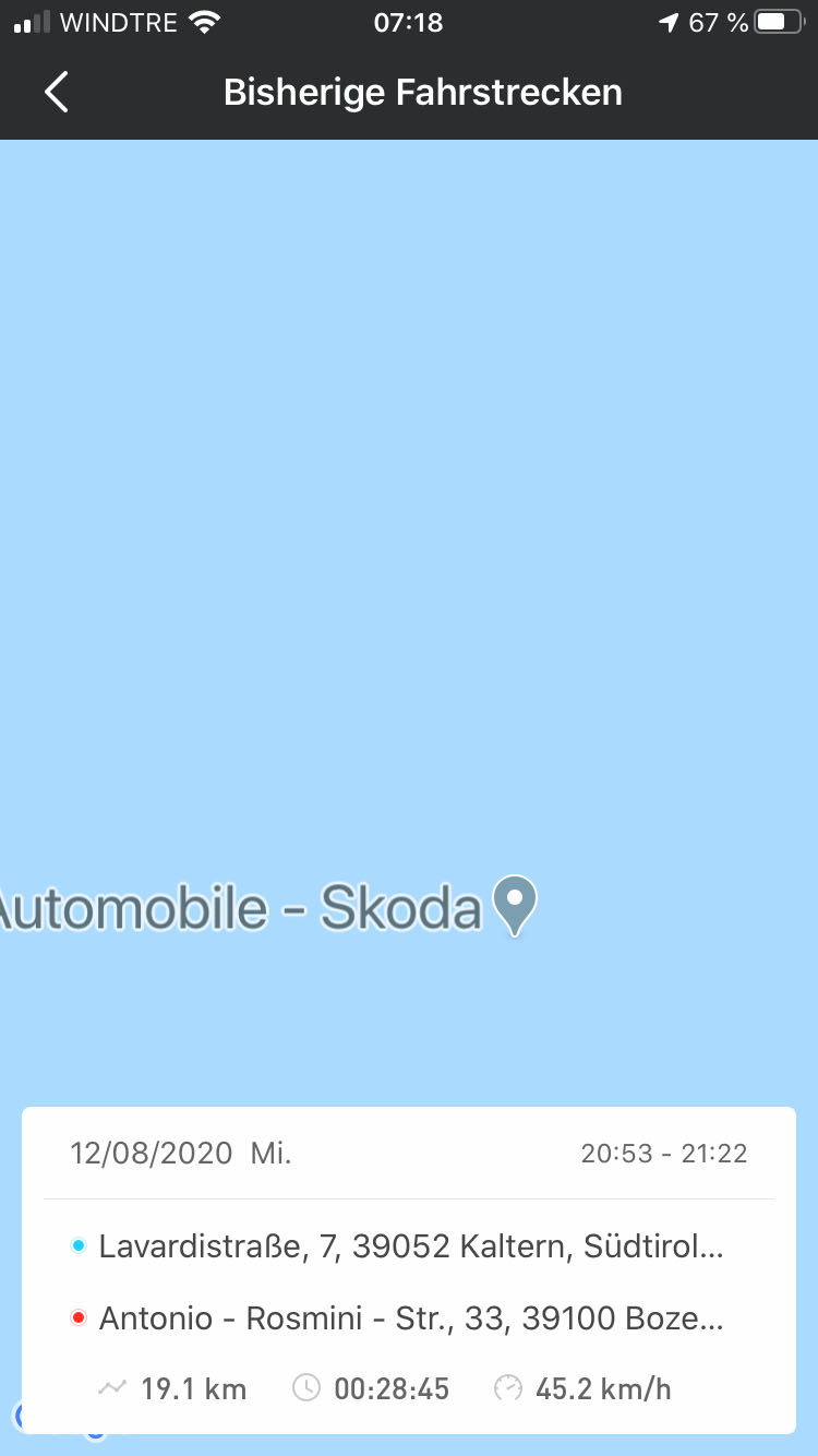 Seit vorgestern sehe ich unter ”Bisherige Fahrstrecken" keine Streckenaufzeichnung mehr, es werden zwar Start- und Zielort als Text angegeben, aber die Strecke wird in der Kartenansicht nicht mehr angezeigt. Die Kartenansicht ist nur blau (mit einer misteriösen „Automobile - Skoda“-Angabe) und wenn ich rauszoome, befinde ich mich irgendwo im Atlantik westlich von Afrika... Ist das bei anderen auch so?