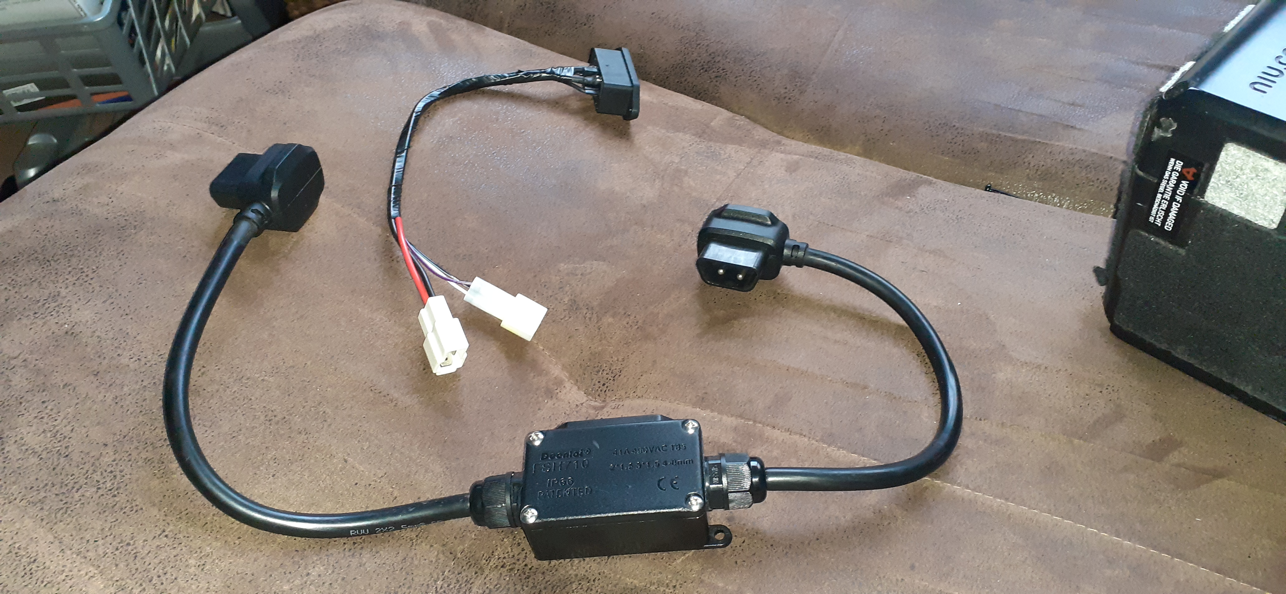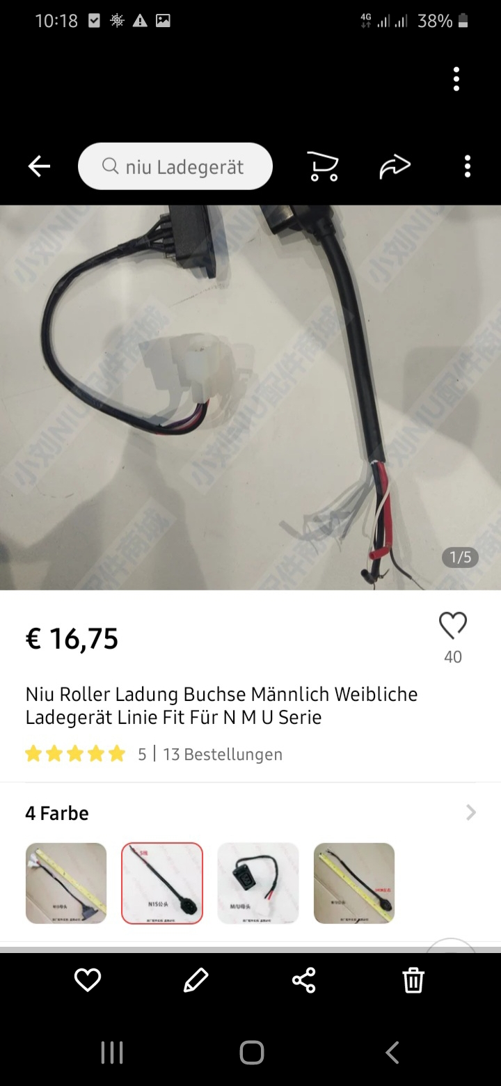 Dies ist eine andere Variante der niu-Buchse, die angeboten wird. Mit dickeren Kabeln und XT60/90 (?) Stecker. Bei beiden Buchsen scheint es sich um Ladebuchsen wie Sie unter der Sitzbank montiert sind zu handeln. Das erklärt auch die Steckerverbindungen die dort ebenso ausgeführt sind. Eine Buchse direkt in der Art wie sie am Akku zur Verbindungsherstellung benötigt wird, konnte ich bis jetzt nicht entdecken. Die Buchse mit den dicken Kabeln dotiert derzeit bei etwa 80 €.