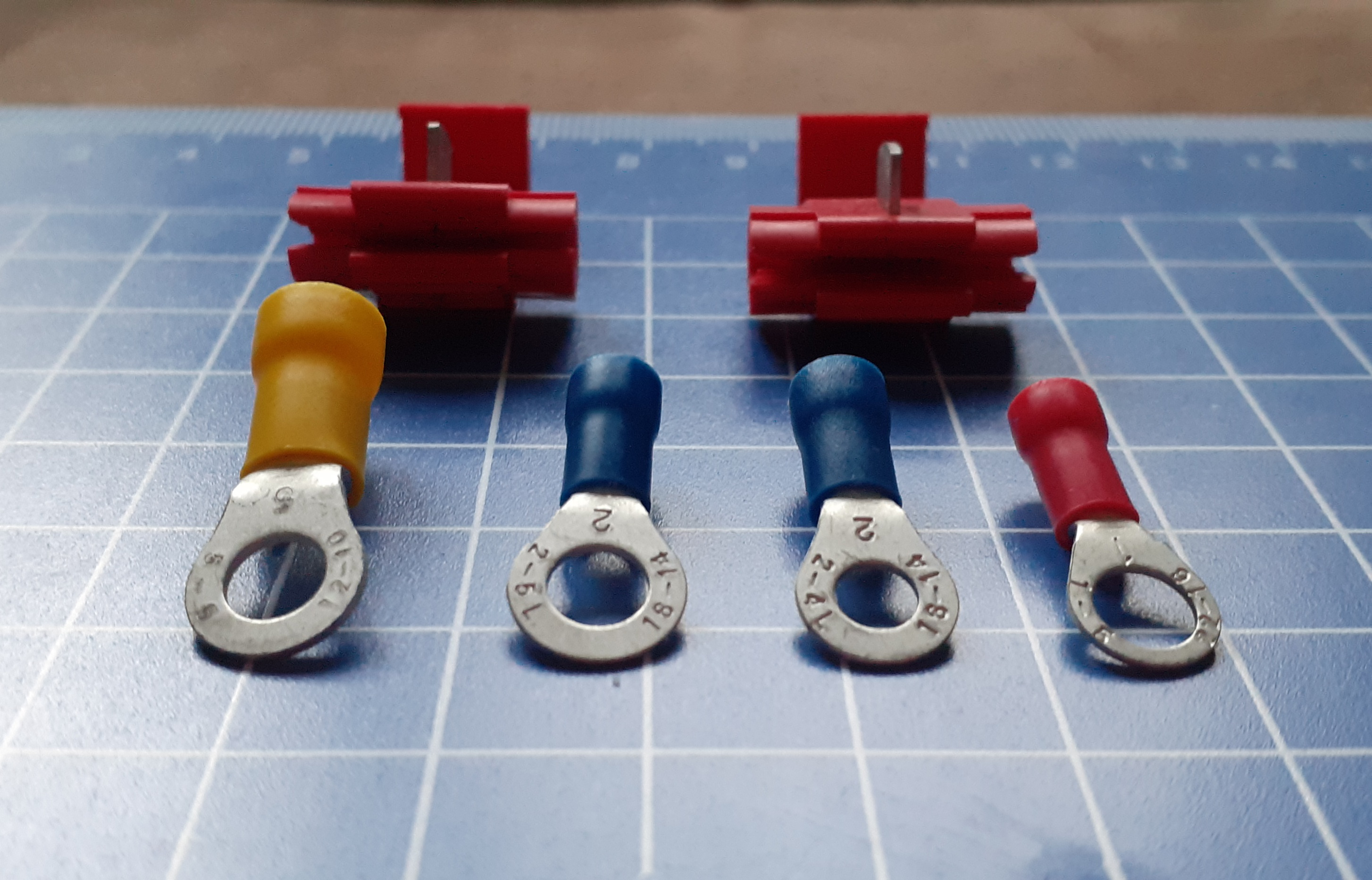Bei den Abzweigverbindern dachte ich zwei hintereinander zu benutzen‽ Auf dem Klemmkontakt steht '1', hinten 22-18 AWG. (also 0,34 - 1mm², eine Nummer zu klein für die 1,5er, bis 105°C; edit)