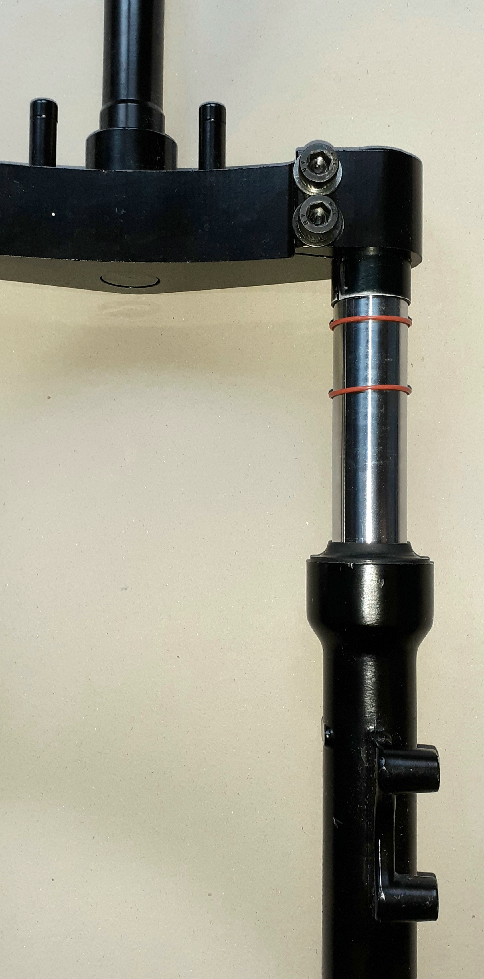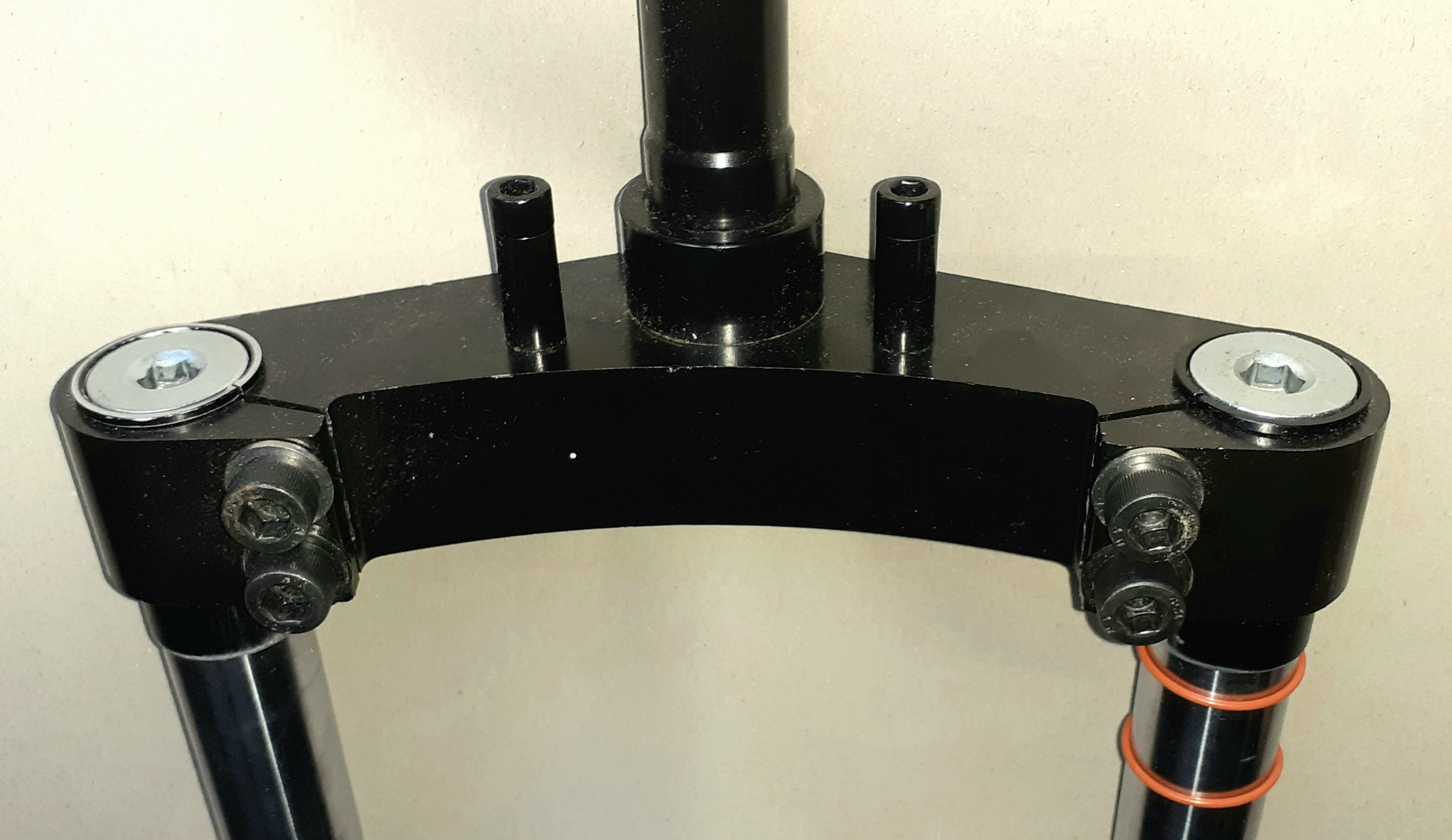 Ich messe im unbelasteten Zustand ziemlich genau 12 cm von der Unterkante der Gabelbrücke bis zur Oberkante vom oberen Dichtungsring. Ich habe die Gabelholme mit zwei passenden Distanzhülsen für Sattelrohrstützen eingebaut. Es musste ein bisschen geschliffen und gefeilt werden damit es richtig passt. Die Gabelbrücke hat ja 33mm, weil ich vorm Kauf nicht gemessen habe und die Gabelrohre 2mm weniger. Die Gabelbrücke ist im Bereich der Klemmung etwa 4,5 mm stark. In diesem Bereich sind die originalen Gabelbrücken scheinbar am empfindlichsten was Verwindungen anbetrifft. Durch die Distanzhülsen erhöht sich der Materialbestand an dieser Stelle um über 20%. Ich könnte mir vorstellen dass dies der Stabilität zuträglich ist. Vielleicht sogar besser als dieselbe Gabelbrücke mit 33 mm Gabelrohren, denn diese haben nur größeren Durchmesser aber vermutlich dieselbe Wandstärke. Die Distanzhülsen ragen aus der Gabelbrücke unten 17mm etwa heraus. Man könnte es einfach abdemeln aber wenn man es so lässt käme es möglicherweise auch der Stabilität zugute. Bis zum Simmering sind 10,2 cm Spielraum. Wenn nun der Federweg nicht größer als 10 cm ist könnte es funktionieren ohne dass der obere Simmering Schaden nimmt.