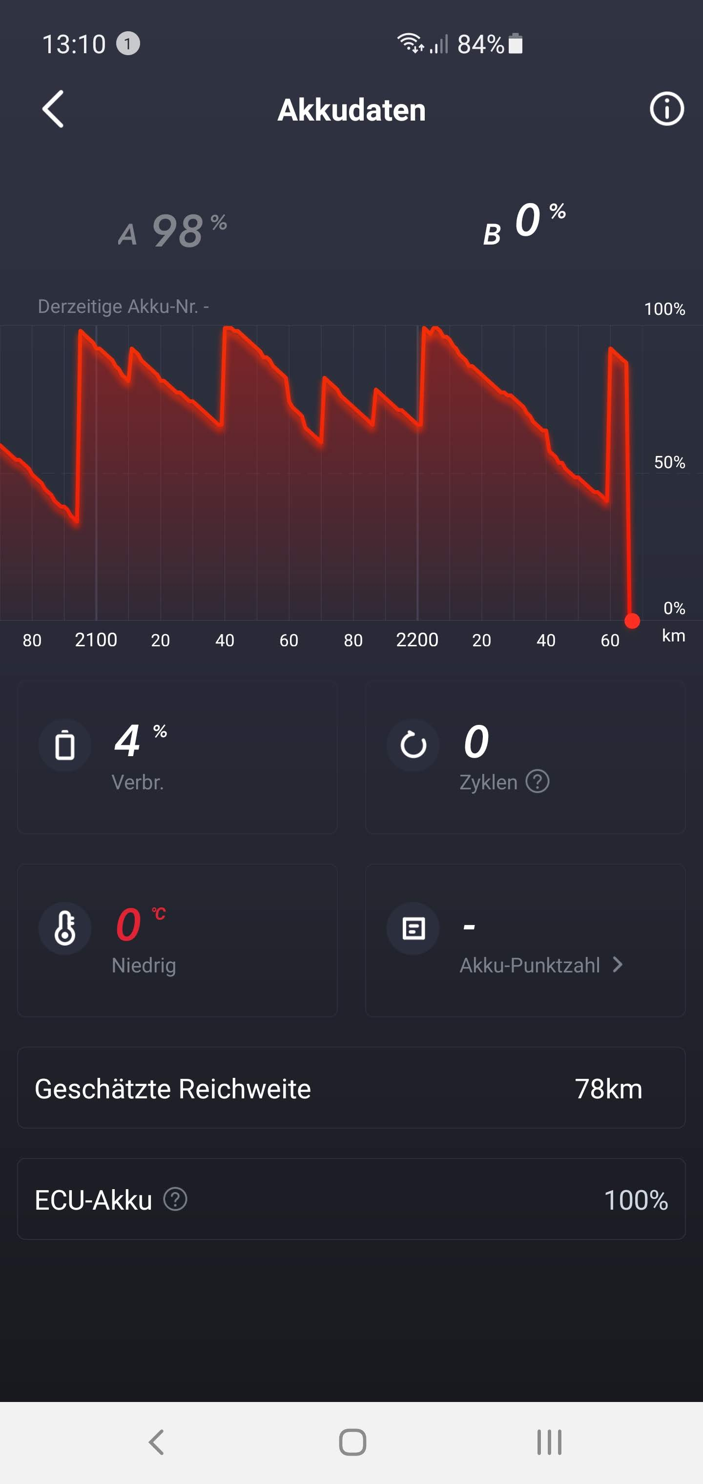 So ein Mist! Gestern wurde mir beim Losfahren nur einer der 2 Akkus angezeigt. Ich habe ihn ausgebaut und direkt ans Ladegerät gehängt. Das Ladegerät zeigt aber kein Laden an - als ob der Akku bereits geladen wäre. Dies geht auch aus dem Ladeprotokoll der App hervor siehe Foto.