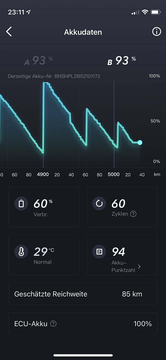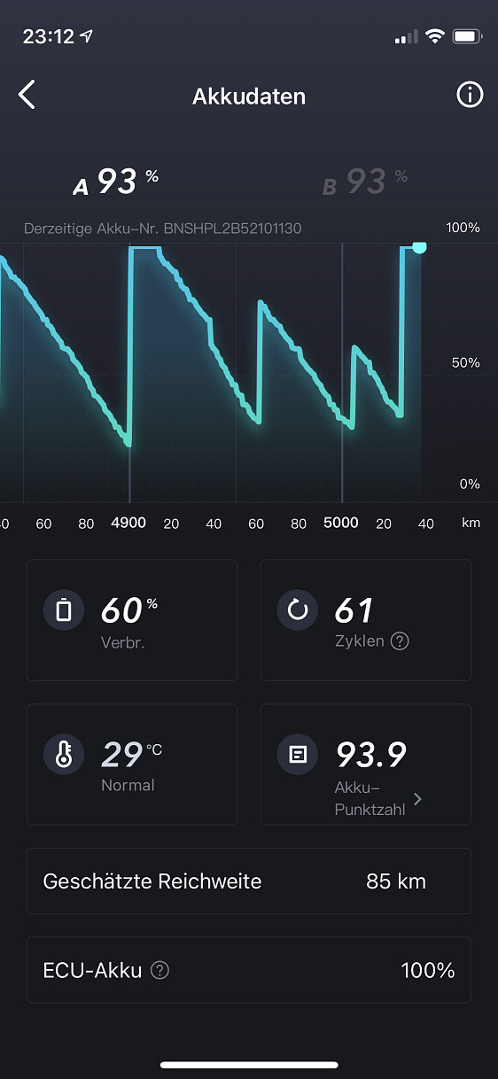 Dann habe ich abgeschaltet und der NIU zeigte am Cockpit 100% Ladung an. Um die Akkus nicht mit 100% stehen zu lassen, bin ich noch eine 8,5km Runde schnell gefahren und das Cockpit zeigt 93% an. Schaue ich mir das in der App an, so sehe ich für Akku A