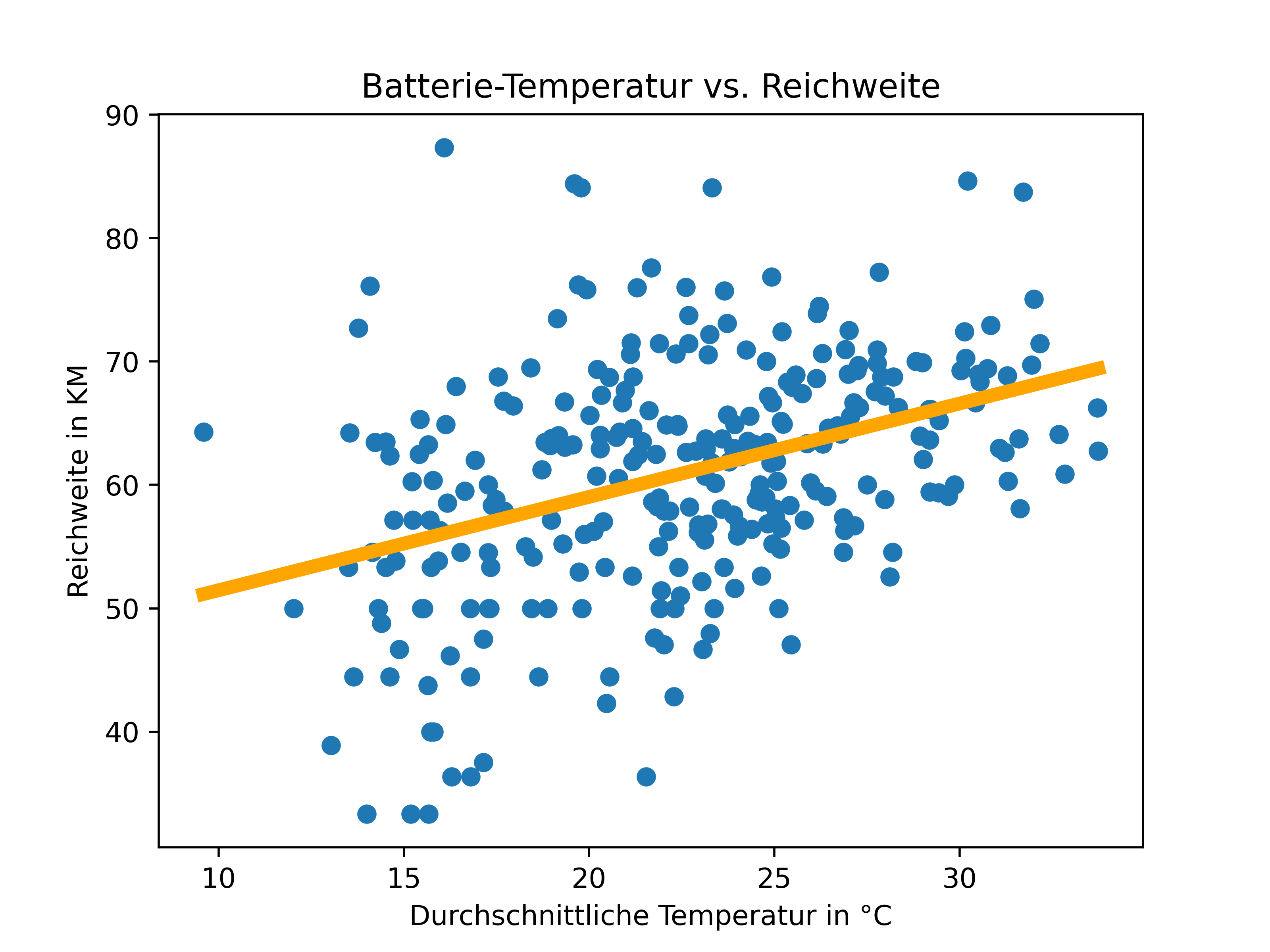 In der ersten Abbildung ist die Reichweite (selbst berechnet über Extrapolation) gegenüber der durchschnittlichen Akkutemperatur gezeigt. Auch wenn der Trend generell schwach ist erkennt man, dass die Reichweite bei hohen Temperaturen höher ist.