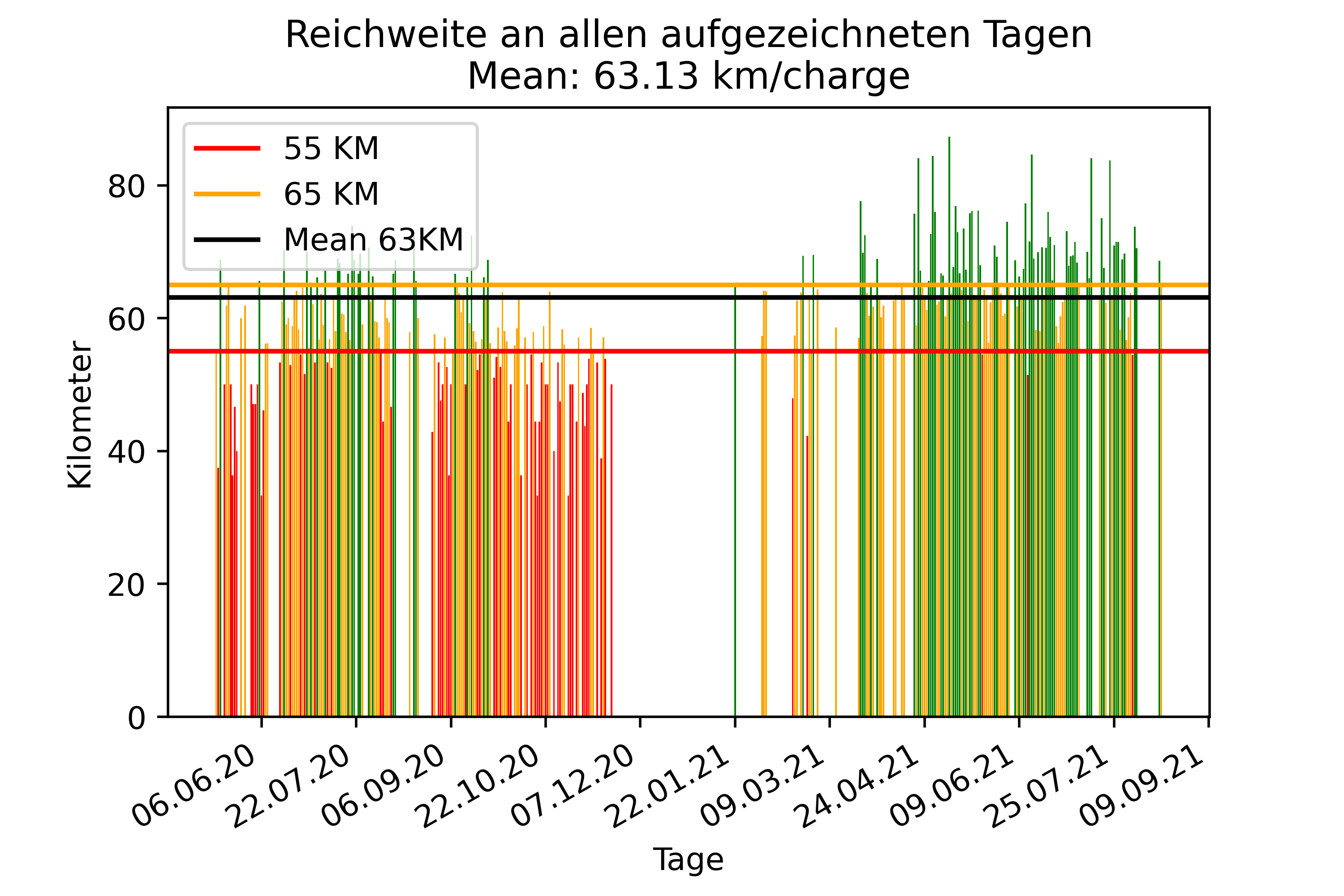 In der zweiten Abbildung ist die Reichweite an verschiedenen Tagen gezeigt - auch hier ist der Winter 2020/21 klar in rot erkennbar. An den meisten Tagen (außer Winter) ist die Reichweite jenseits der vom Hersteller angegebenen 60KM.