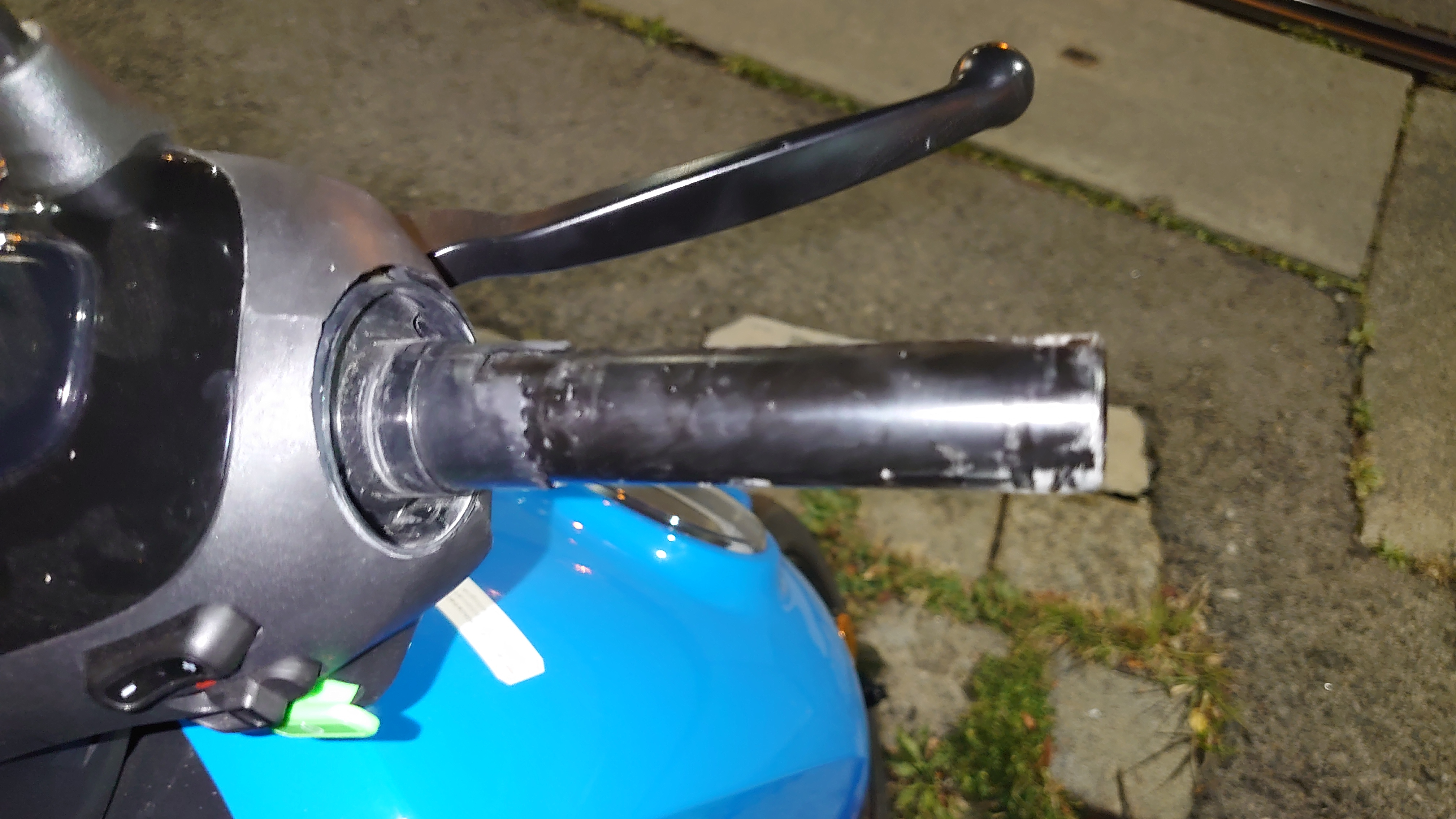 Heute kam mir die Idee zur Lösung, und damit das erledigt ist hab ich's gleich gemacht: Tante Louise hat dezente Lenkerenden (10028737) für unter dreizehn Euro, und die passen mit den beiliegenden Adaptern perfekt ins Lenkerrohr (18 mm). Links zum Test also den Griffgummi mit einem Messer so gekappt, dass das Lenkerrohr sichtbar wurde, und von innen festgeschraubt. Rechts hab ich das gleiche versucht, da bin ich aber vor dem Lenkerrohr noch des Gasgriffs bzw. seiner Kunststoffseele ansichtig geworden - also von innen angezeichnet, abgenommen und mit der Laubsäge um 2,5 mm gekürzt. Beim Montieren einen zusätzlichen Millimeter Luft gelassen, damit sich das Gas leichtgängig wieder zurückstellt, und gut is'.