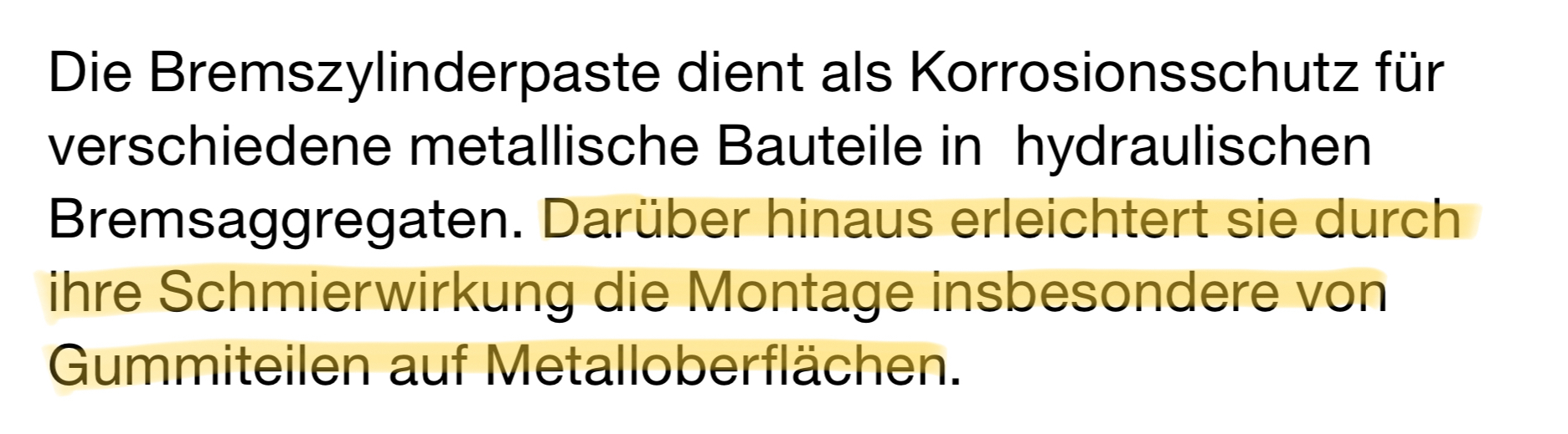 An den metallenen Rückseiten der Beläge wird dagegen Keramik-Paste (oder bei unbeirrbaren Historikern ggf. auch Kupferpaste) als Hochtemeraturfeste Gleitsubstanz eingesetzt. Da muss alles fettfrei bleiben. Das Mittel vermeidet dort ein Festbrennen, bei hohen Brems-Temperaturen, baut aber nicht den reibungsarmen Gleitfilm (von Fett) auf.