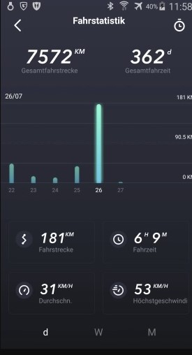 Im Reallife, also digitaler Fahrstil, sind sichere 87km im Sommer drin, und mit anschließender Schleichfahrt auf Reserve werden es rund 102km, und das auf den Klebereifen K58.
