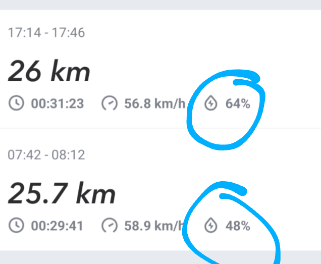 Ich habe auf dem heutigen Weg zur Arbeit 25% Akkukapazität verbraucht (beide Akkus stehen bei 75%) und in dieser Wegstreckenanzeige steht 50%.