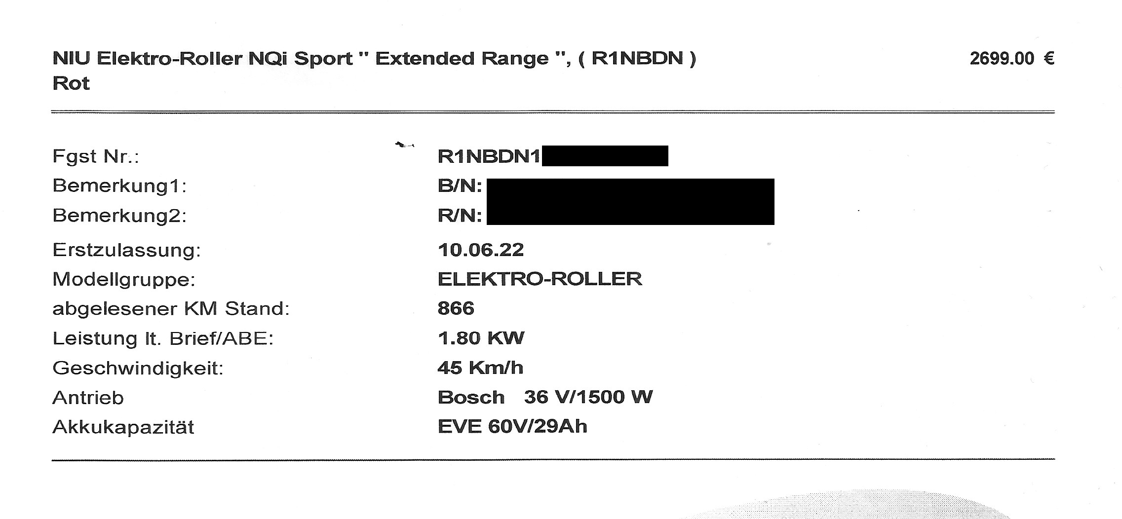 Ich habe, nachdem ich meinen Evo zurückgegeben habe, den NQI Sport gekauft, den mir der Händler als Ersatzfahrzeug während des 13-wöchigen Werkstattaufenthalts des EVOs zur Verfügung gestellt hat. Ich habe mich so an dieses Fahrzeug gewöhnt,dass ich es dann einfach übernommen habe. Im Gegensatz zum Evo läuft dieser Roller seit 1500km ohne jegliche Macken. Einzig die vordere Bremsscheibe hat sich wohl verzogen, denn er "rubbelt" jetzt beim Bremsen. Jetzt allerdings zum eigentlichen Thema: Meine App weist mir eine Reichweite von 70 km bei 100% Ladezustand aus. Genau überprüft habe ich das nicht, aber grob überschlägig stimmt das. Ich werde das jetzt aber mal genau dokumentieren. Laut Rechnung des Händlers habe ich eine "Extended Range" Version. Allerdings hat mein Akku "nur" 29 Ah Kapazität. Wenn ich ich mich im Netz umschaue, haben die ER Modelle alle Akkus über 30Ah. Irgendwie scheint da etwas nicht zusammen zu passen. Einerseits wird die Reichweite auf der App mit 70km angezeigt, andererseits hat der Akku nur 29Ah. Ist der Akku wirklich eine ER Akku? Es ist ja nicht so, dass ich mit der Reichweite nicht zufrieden bin. Allerdings möchte ich auch nicht über's Ohr gehauen werden. Wenn auf der Rechnung "Extended Range" steht, sollte auch ein entsprechender Akku drin sein: