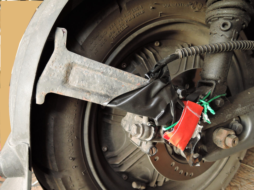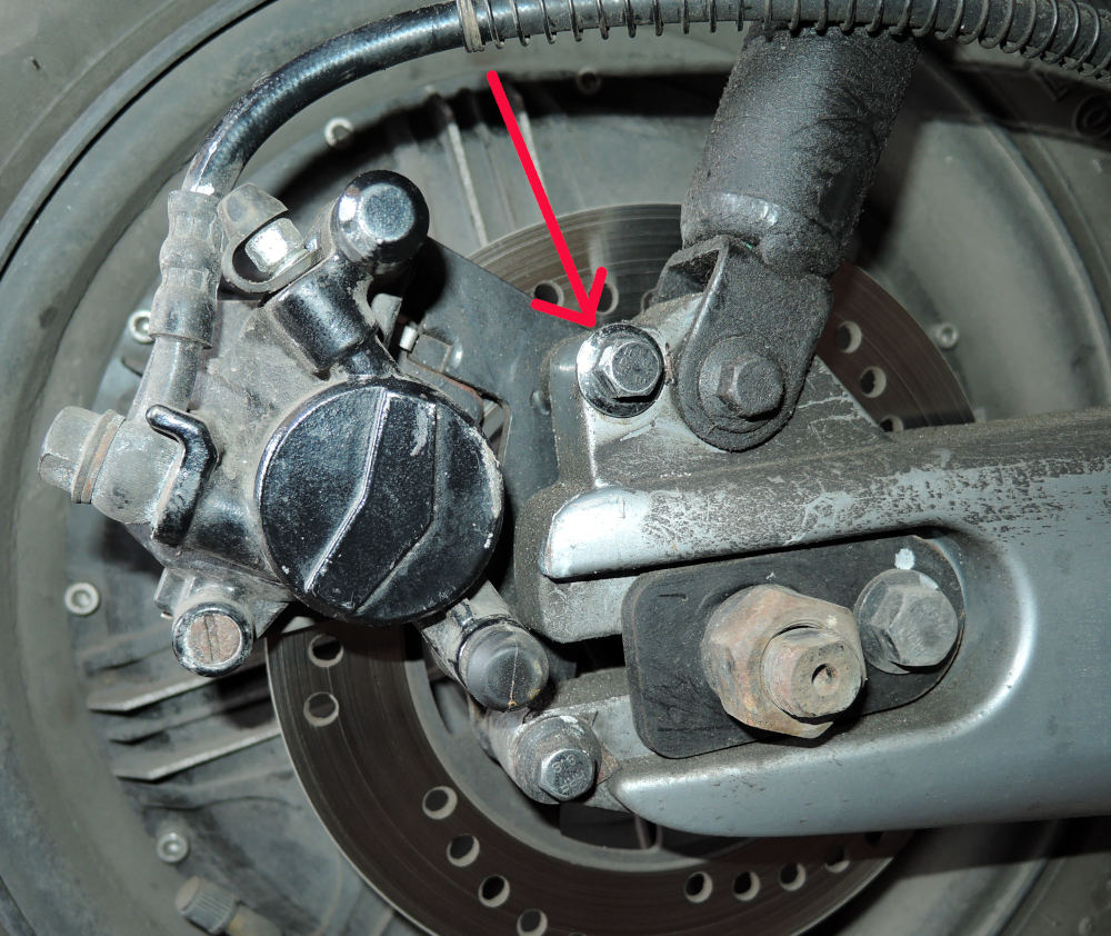 Das andere zeigt den Status jetzt (nach Abnahme der Teile) an der rechten Radnabe und der rote Pfeil weist auf diejenige Schraube, an welcher das nun abgebrochene Teil festgeschraubt war.