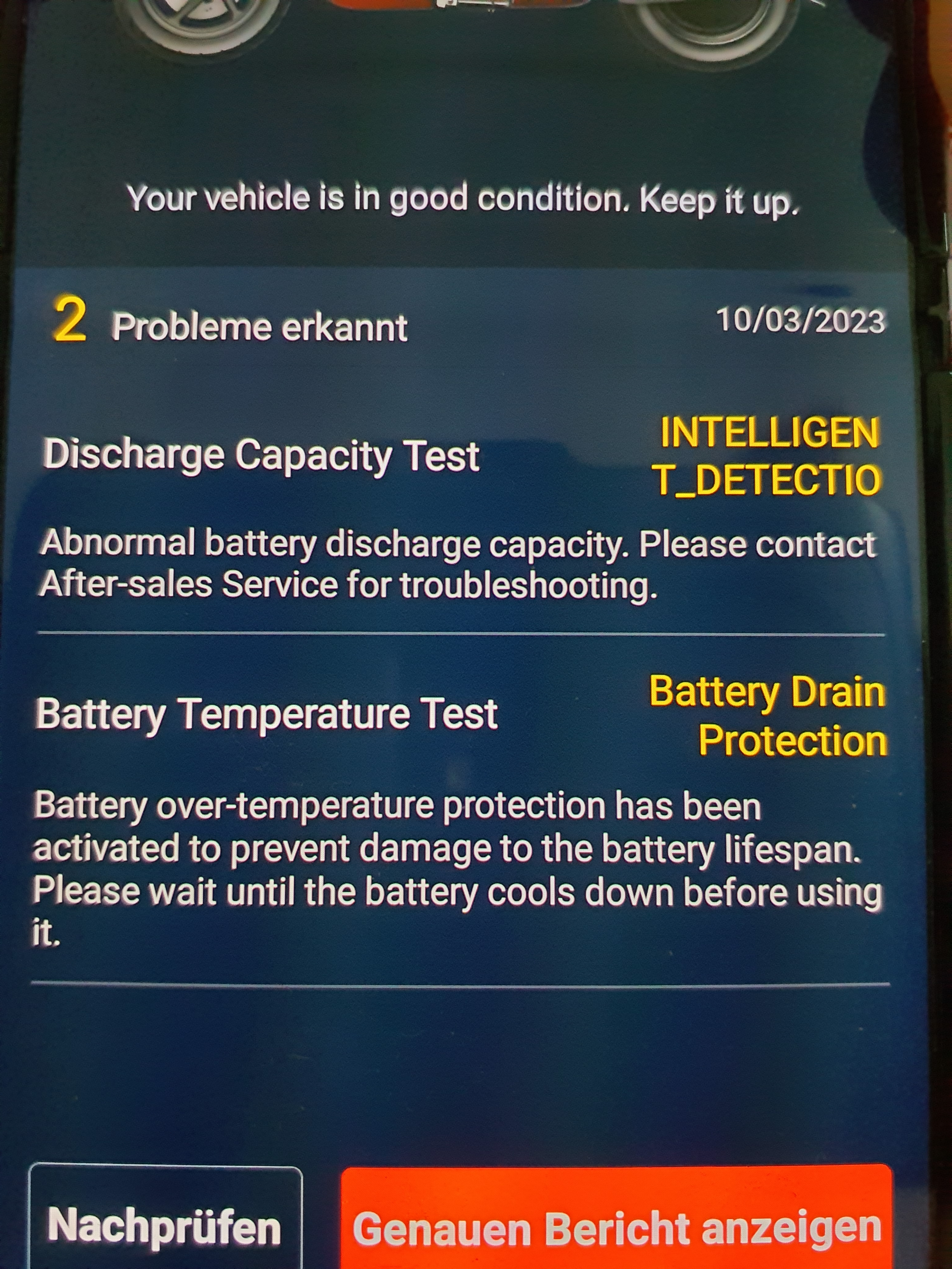 Laut der App sind zwei Fehler hinterlegt,Überhitzung und abnormale Batterie Entladung.