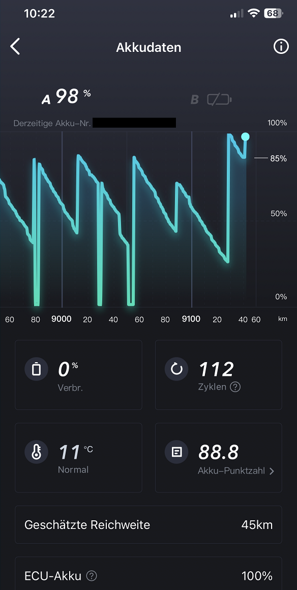Da die Akkus dann rappel voll waren, bin ich eine 16km Runde mit ziemlich viel Speed gefahren - beide Akkus hatten danach noch 85% Restladung.