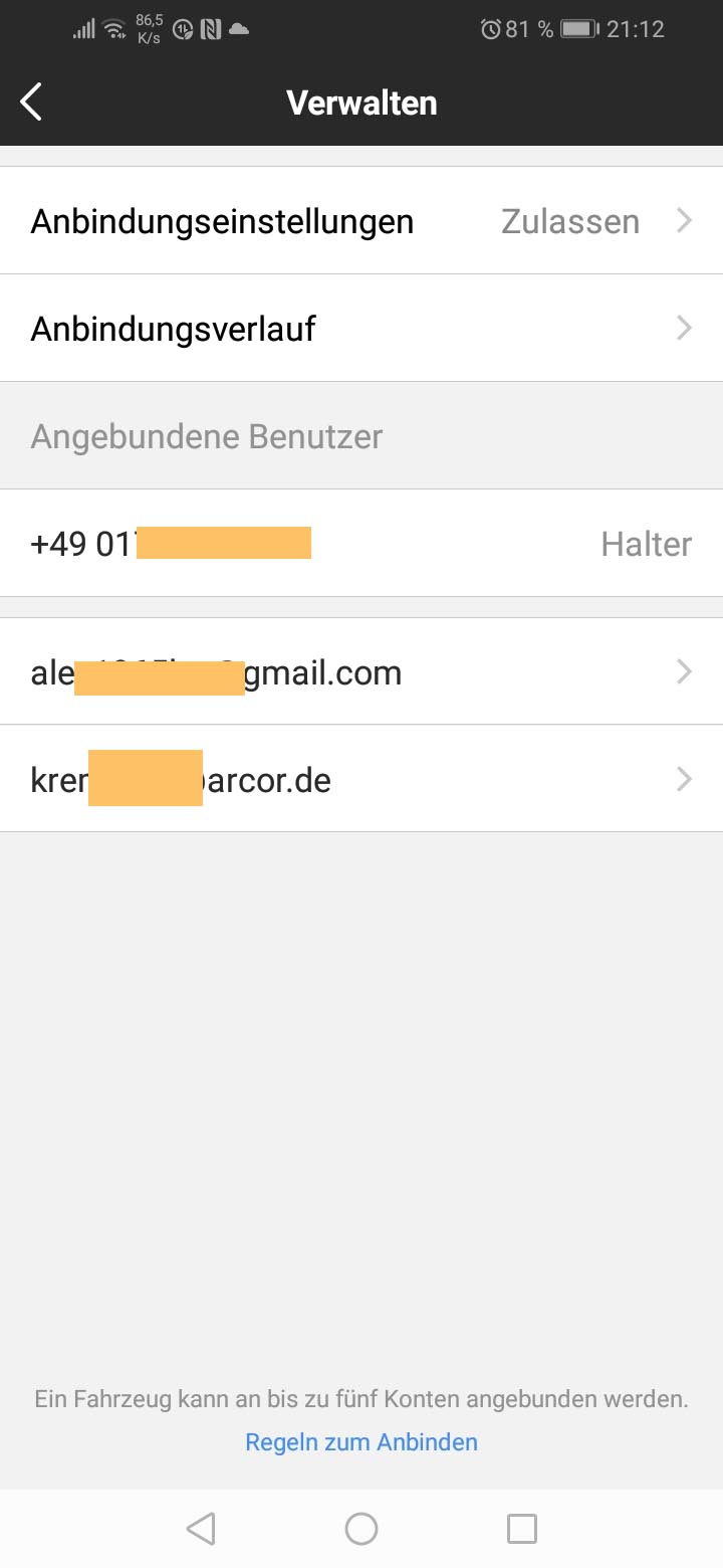 Ich habe vom alten Besitzer einen Screenshot bekommen bevor er sich abgemeldet habe. Ich bin die untere (arcor) Email Adresse. Kann es sein das der Besitzer 2 Accounts hatte? Den Halter mit Telefonnummer und die gmail Adresse welche dann vielleicht nach dem Abmelden der neue Halter ist?