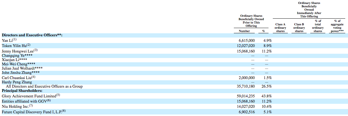 Es scheint auf jeden Fall so zu sein, dass keine europäischen oder amerikanischen Investoren dahinter stehen, soweit man das bei den ganzen kryptischen offshore Firmennamen sagen kann.Represents 14,027,020 ordinary shares held by Niu Holding Inc., a BVI business company. Mr. Token Yilin Hu, our director and vice president, and Mr. Carl Chuankai Liu, our vice president, each holds 85.7% and 14.3% of Niu Holding Inc., respectively. The registered address of Niu Holding Inc. is Vistra Corporate Services Centre, Wickhams Cay II, Road Town, Tortola, British Virgin Islands VG1110. All the ordinary shares held by Niu Holdings Inc. will be re-designated and reclassified as Class B ordinary shares immediately prior to the completion of this offering.