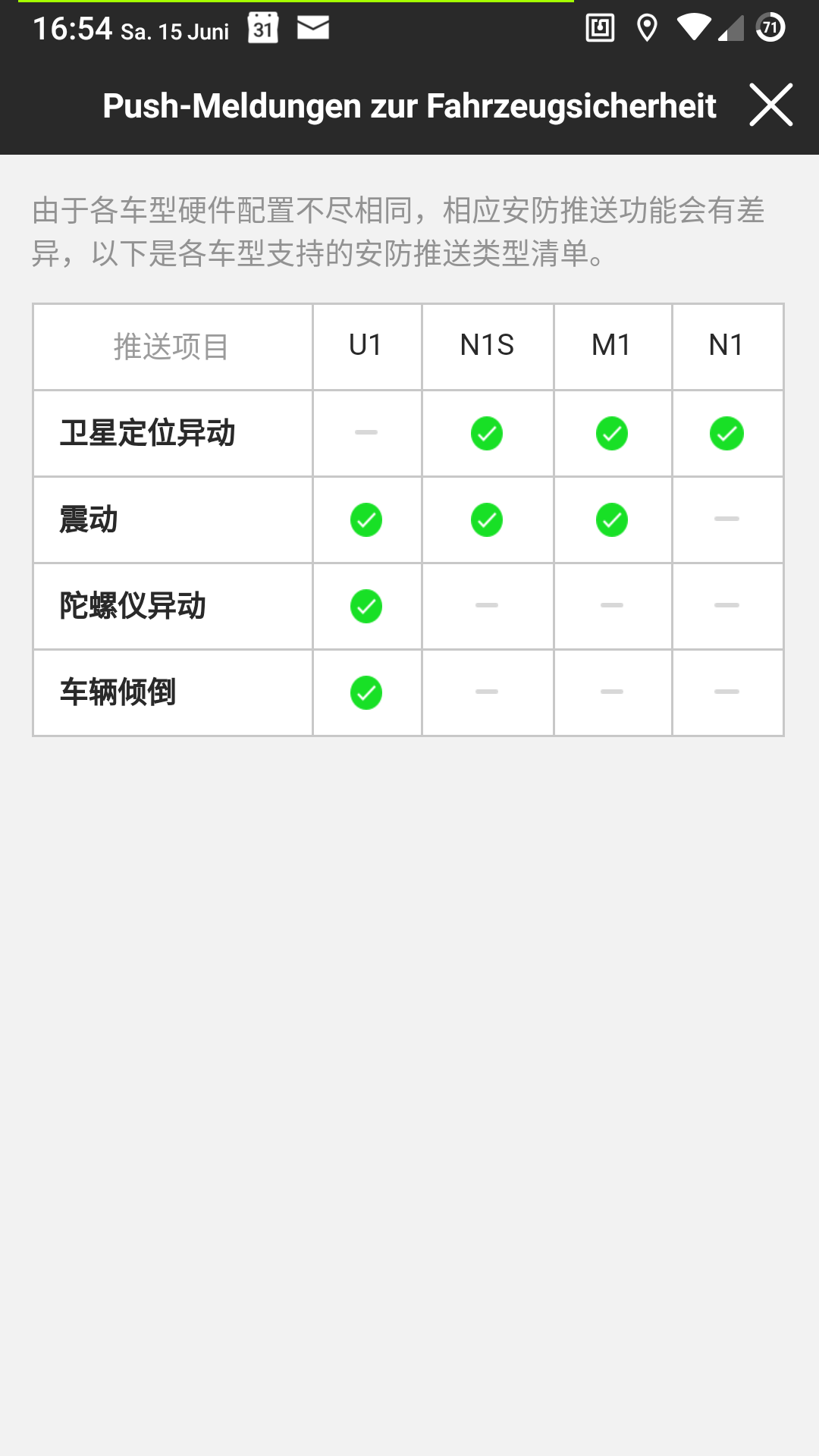 Mein Vermutung ist, dass Niu versucht, die Anti-Diebstahl-/Alarmmeldungen für die ECU's (PC-Version 2) wie die Ngt & Npro funktionieren zu lassen, die in der Niu App eine Benachrichtigung erhalten, wenn z.B. der Roller umgefallen ist, wenn der Roller vibriert, wenn der Roller bewegt wird, wenn der Roller geparkt wird (Zündschloss in der Position "Aus" oder "Schloss").