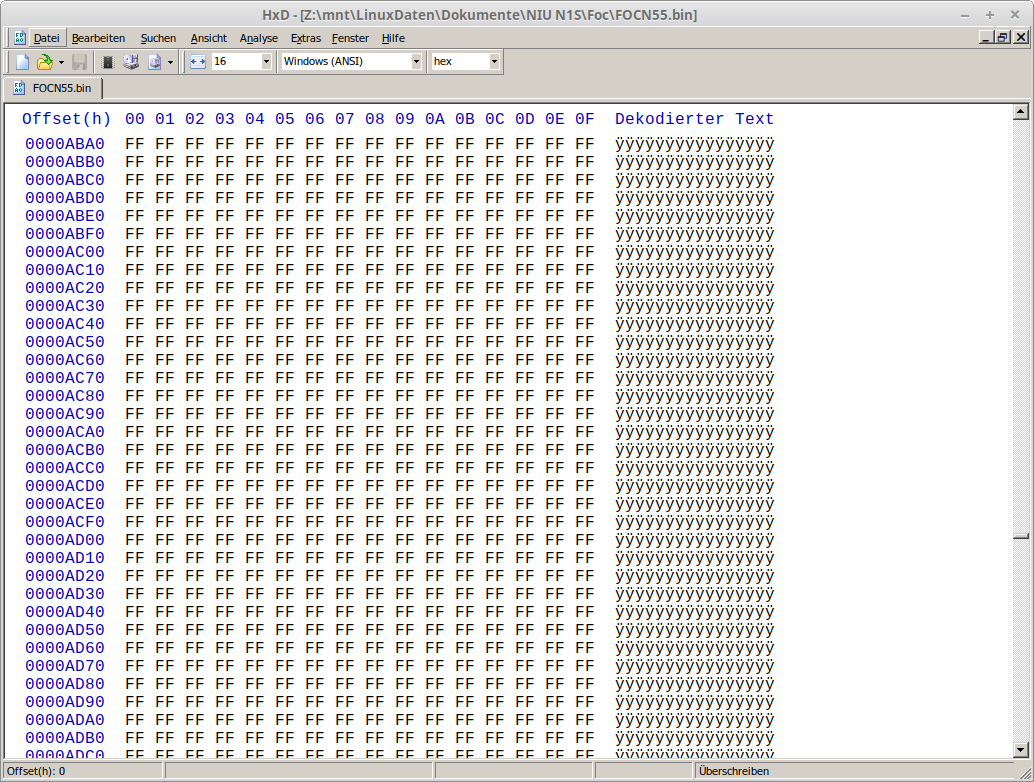 Die Bin-Datei ist auch nur zu etwa 50% gefüllt, der Rest ist hexadezimal "FF" was auf einen nicht beschriebenen Bereich eines EPROM's oder EEPROM's hinweist. EEPROM wohl, da die Datei programmiert werden kann.