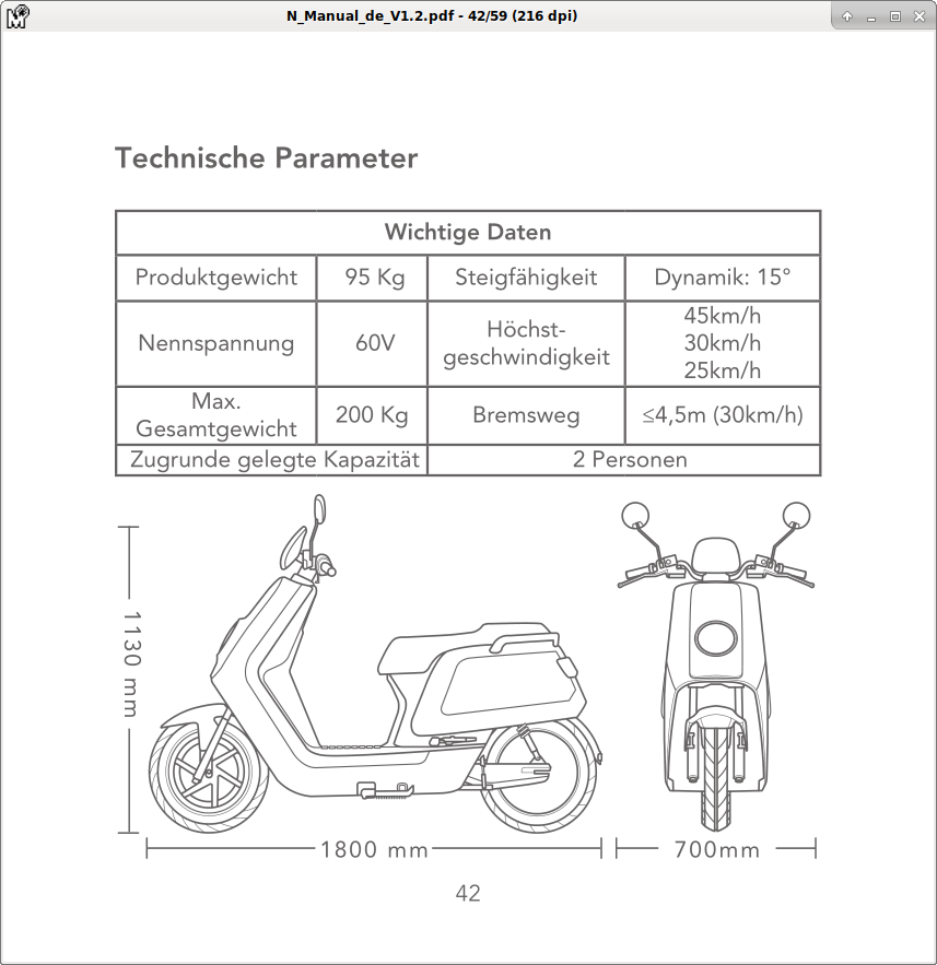 Das Problem ist, ich bin mit meinen fast 1,90 und der leider etwas verringten Eigenbewegungsmöglichkeiten mittlerweile über 100 KG. Ich meinte irgendwo gelesen zu haben, dass der NIU auch bis 200KG verkraftet. Tatsächlich gibt aber der Hersteller online 155KG Zuladung an. https://www.niu.com/de/n-series/specs/