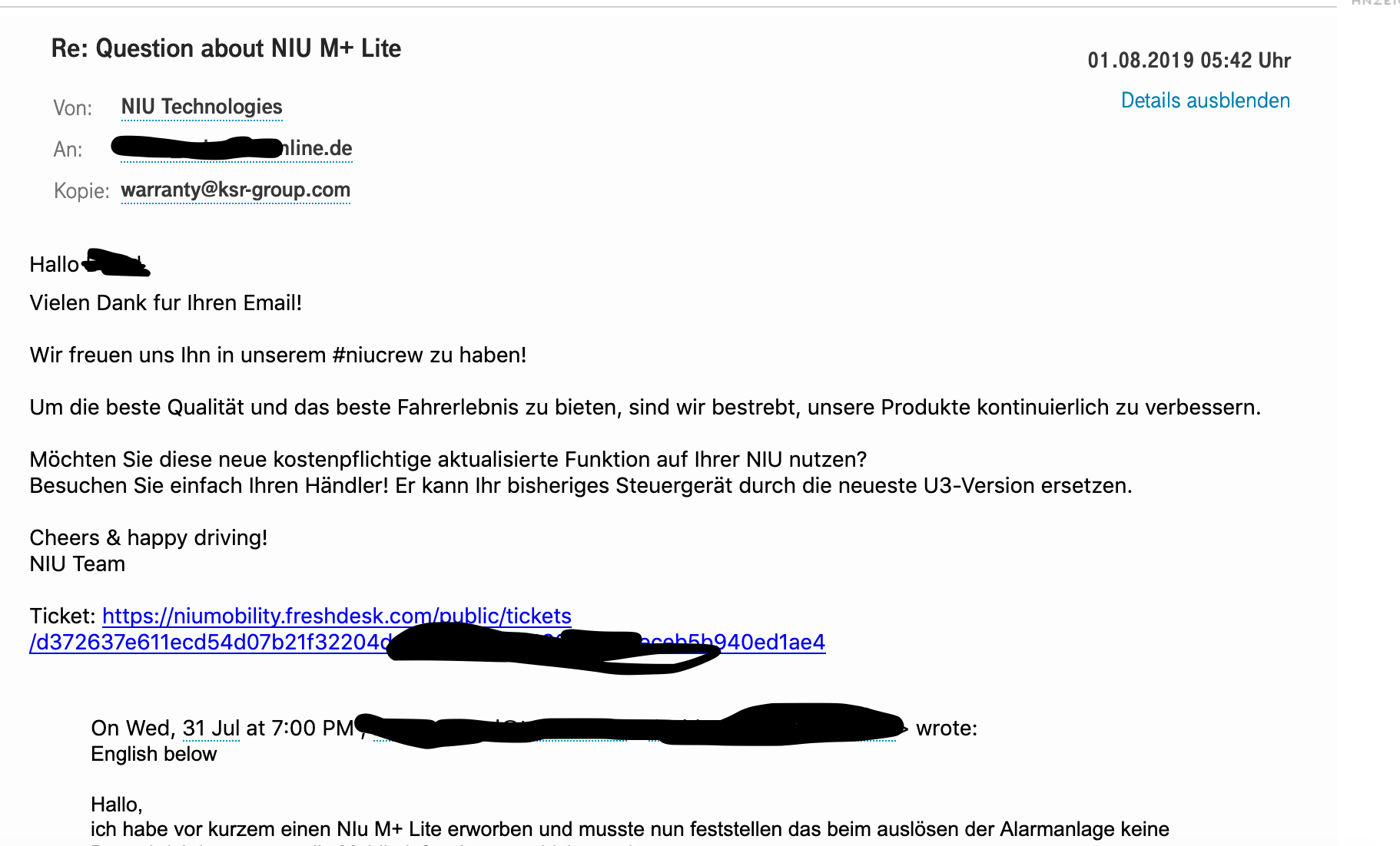 Auch wenn das Unmut erzeugt hat, kann ich das Gebaren von NIU etwas verstehen. Sie brauchen dafür Unmengen der neuen ECUs und sowas geht nicht von heute auf morgen. Sie sind da ja auch von Lieferanten abhängig. Bis die Dinger hier sind ein paar Monate ist absolut realistisch.